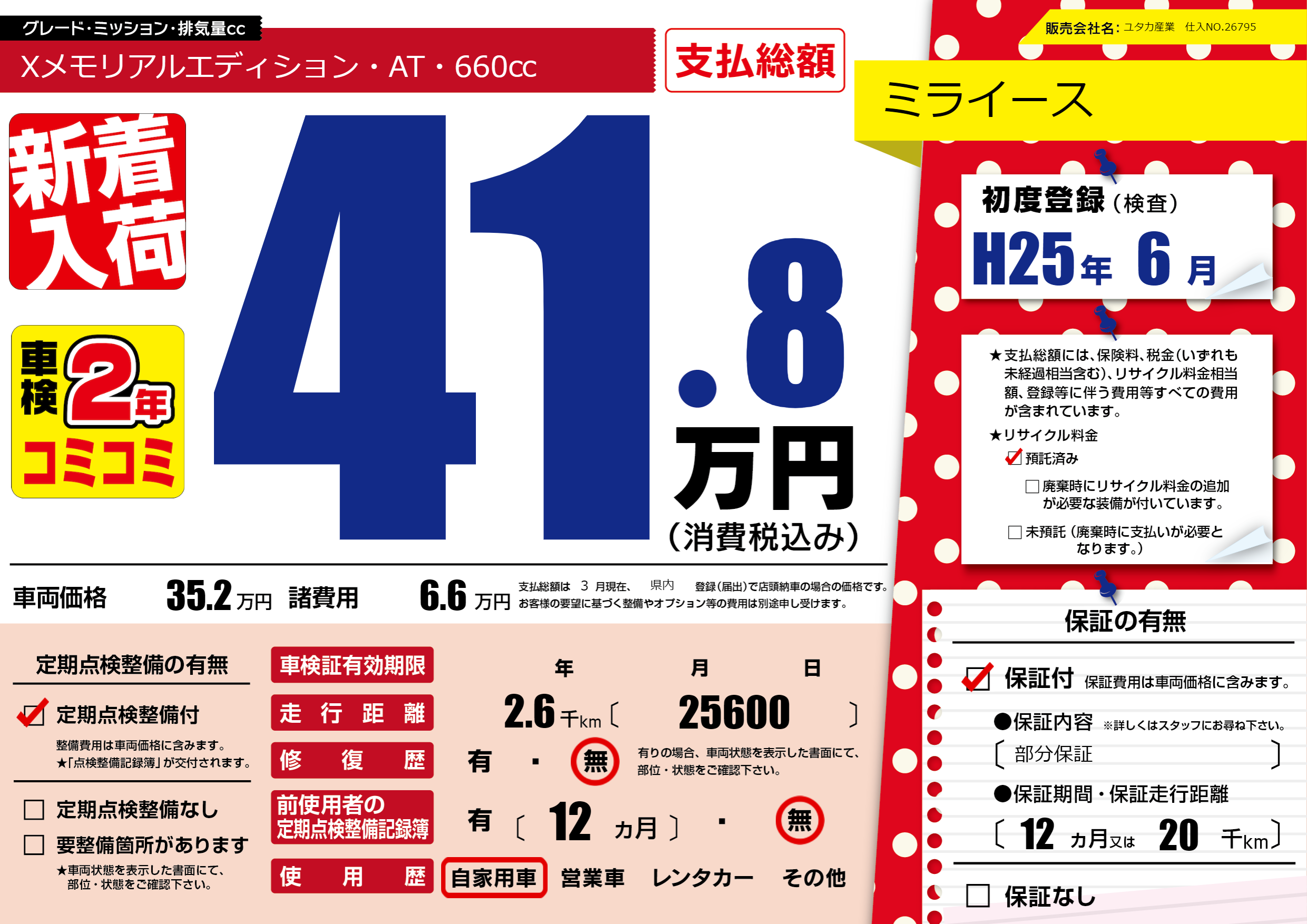 | 走行キロ | 0.2万km | 初年度登録 | H25年6月 |