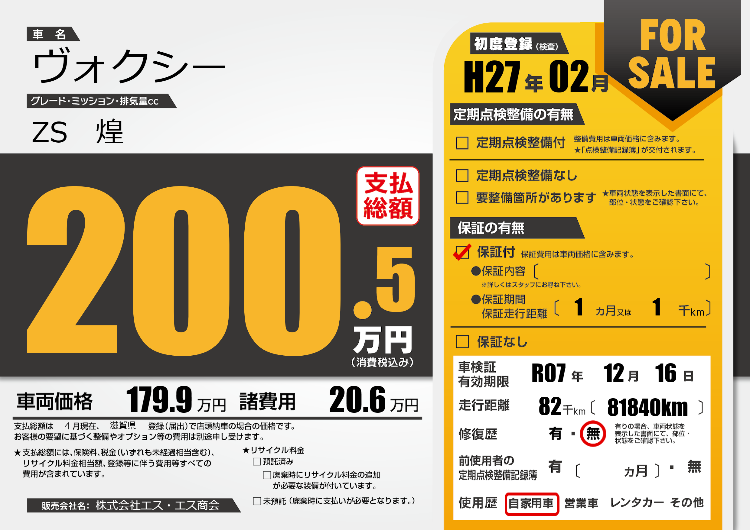 | 車名 | ヴォクシー | グレード ミッション 排気量 |