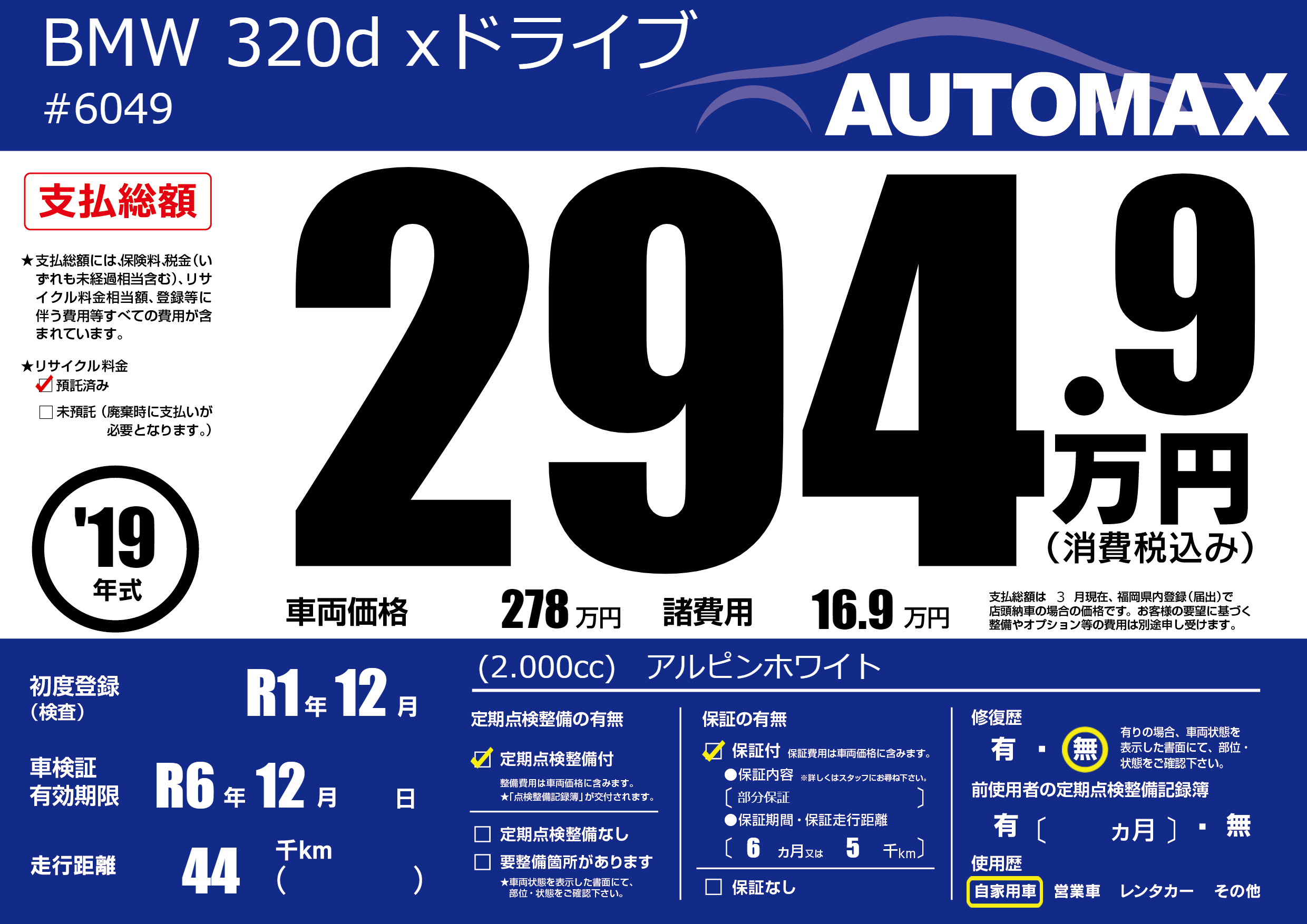 | 車名 | BMW 320d xドライブ | グレード ミッション 排気量 |