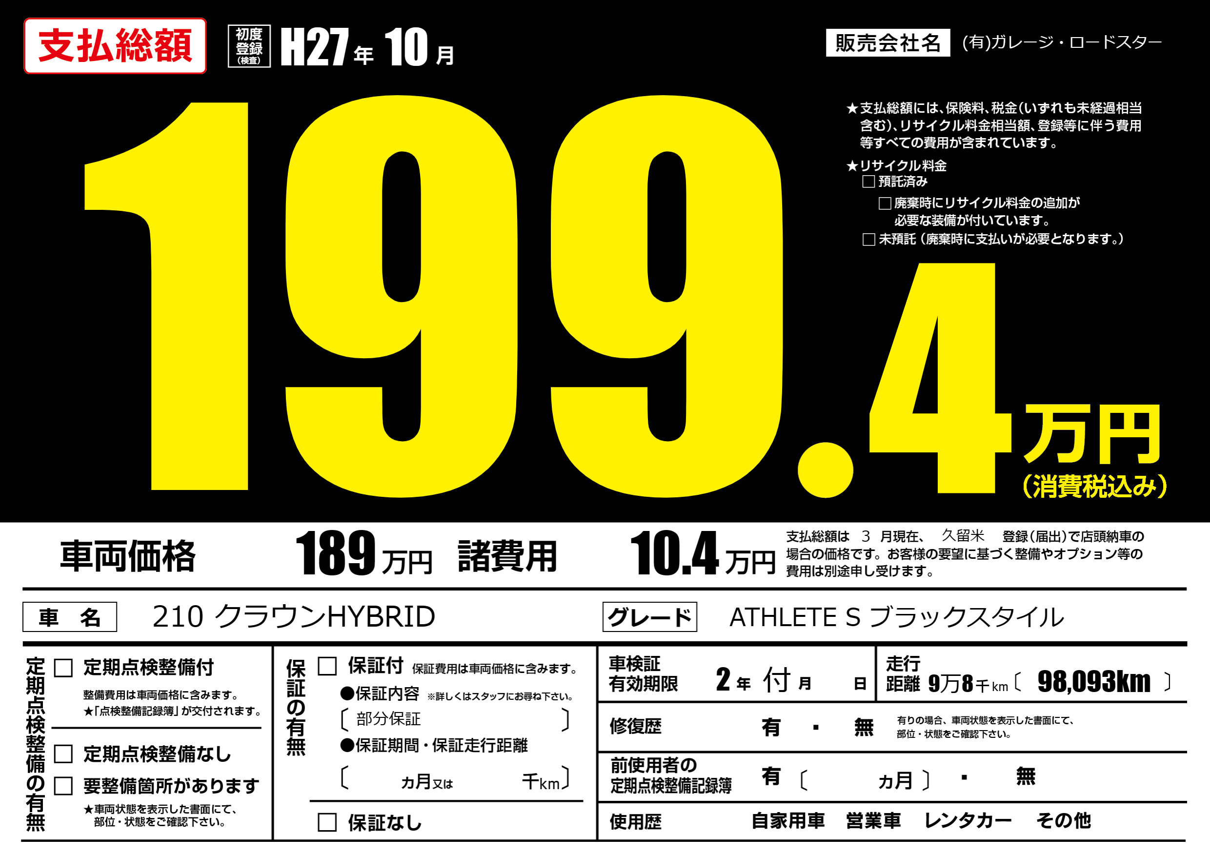 | 車名 | 210 クラウンHYBRID | グレード ミッション 排気量 |