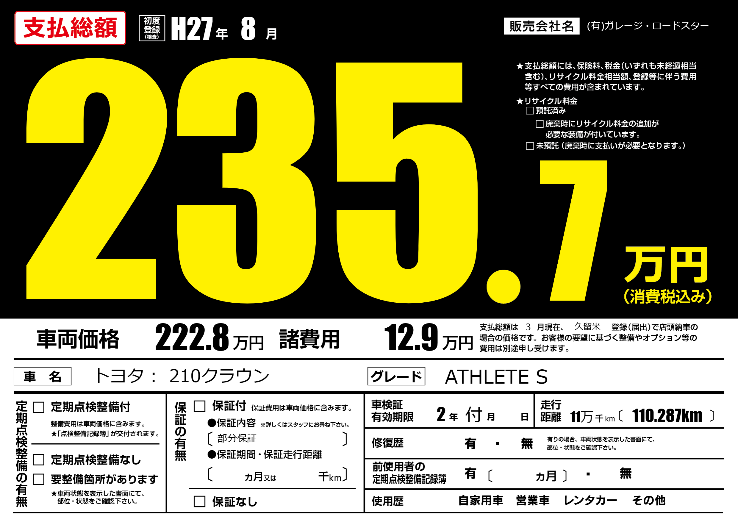| 車名 | トヨタ : 210クラウン | グレード ミッション 排気量 |