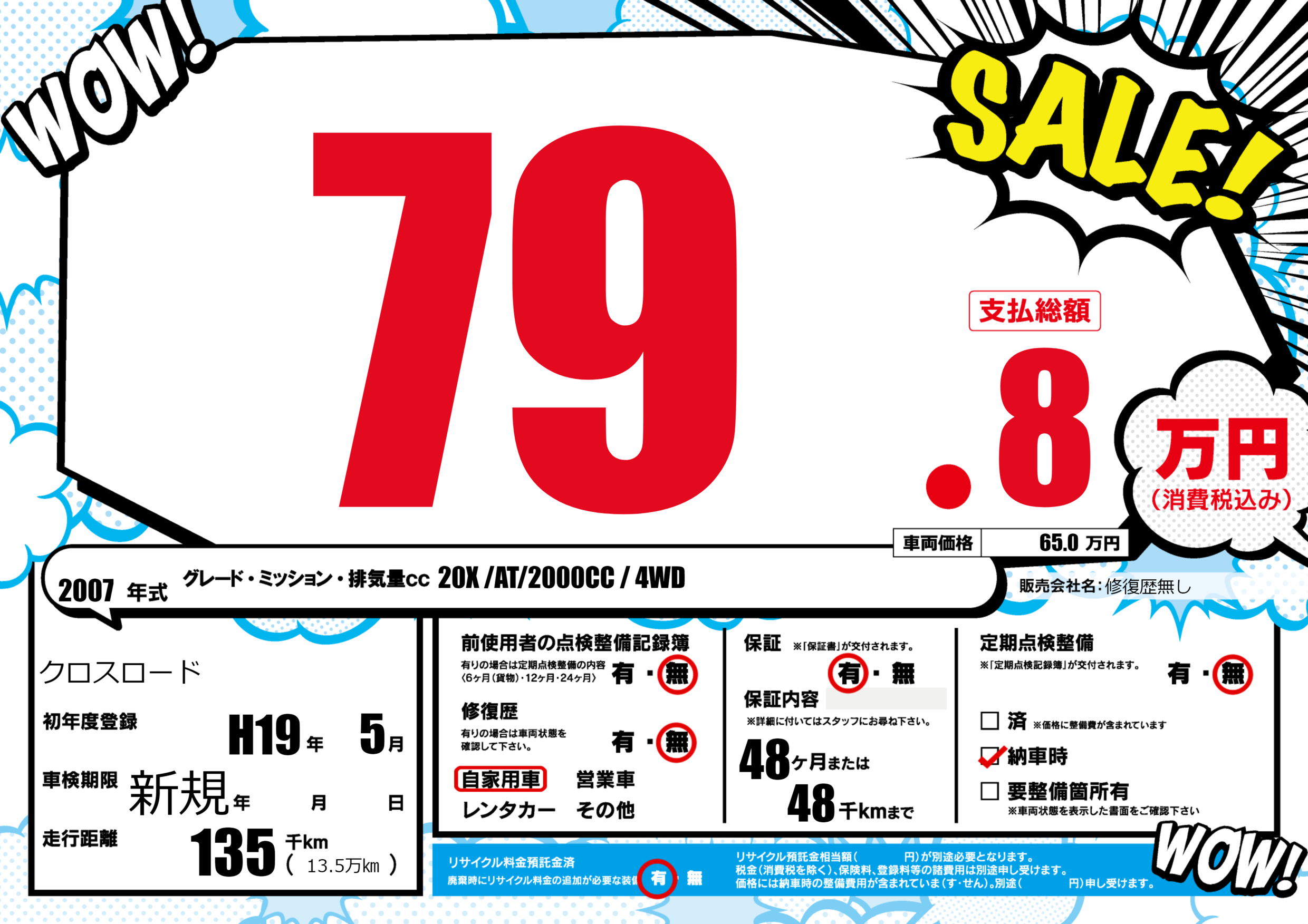 | 走行キロ | 13.5万km | 初年度登録 | H19年5月 |