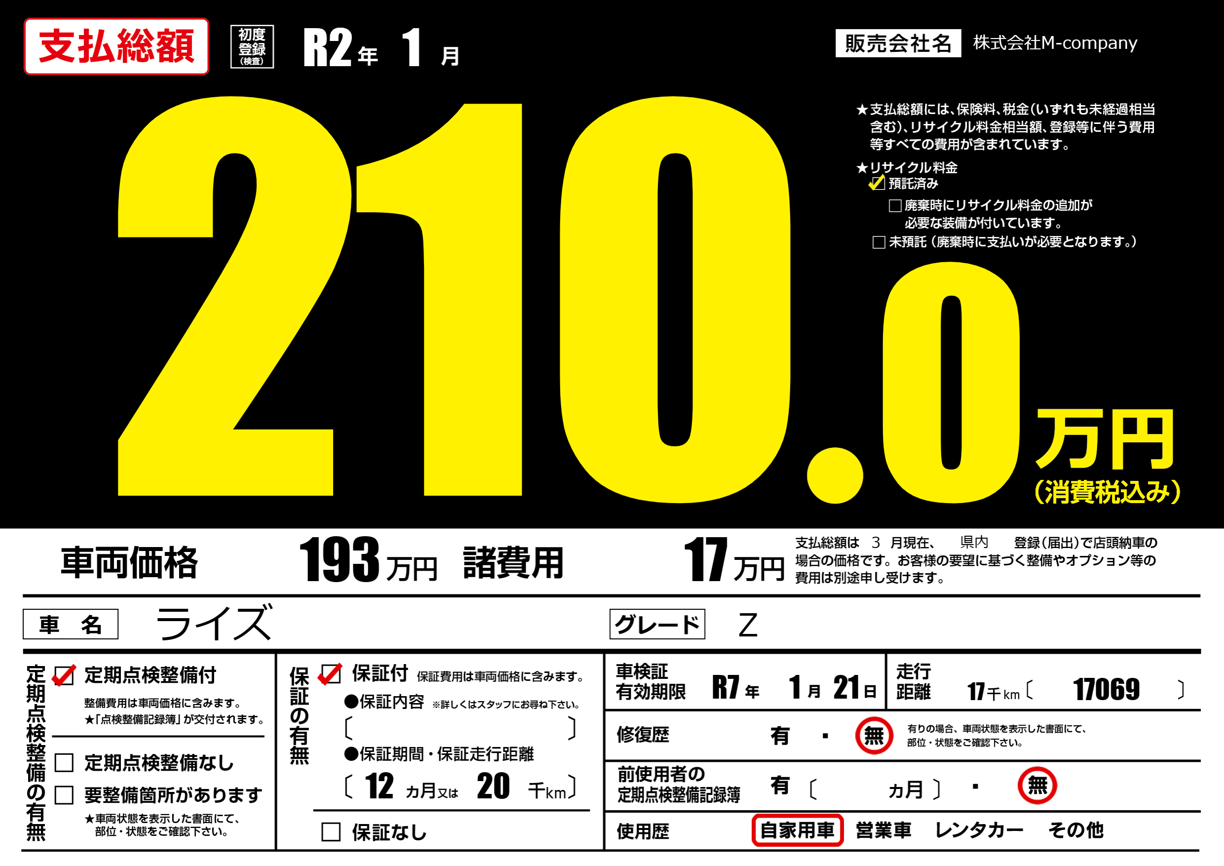 なし | 車検制限 | R7年1月21月 |