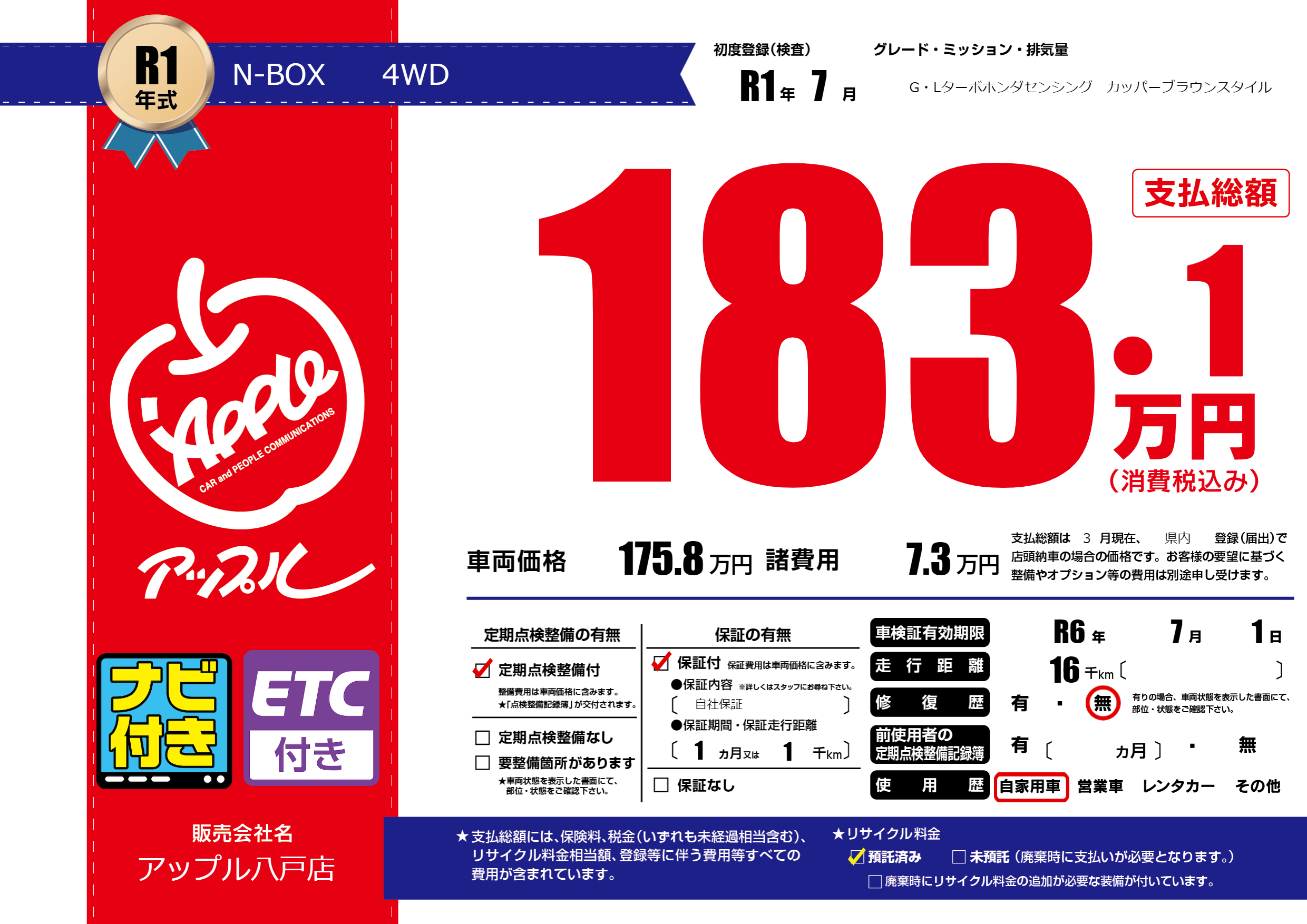 | 車名 | N-BOX 4WD | グレード ミッション 排気量 |