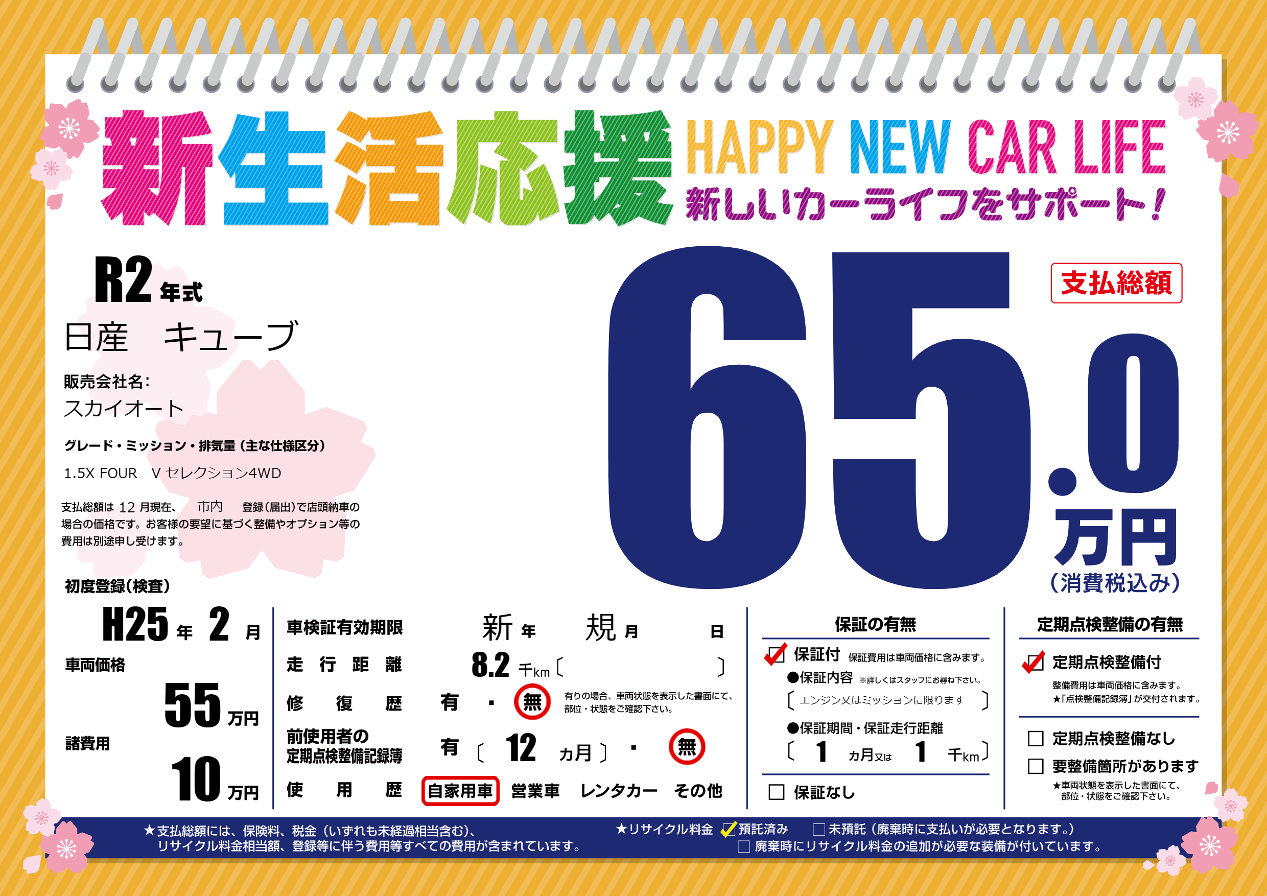 | 車名 | 日産 キューブ | グレード ミッション 排気量 |