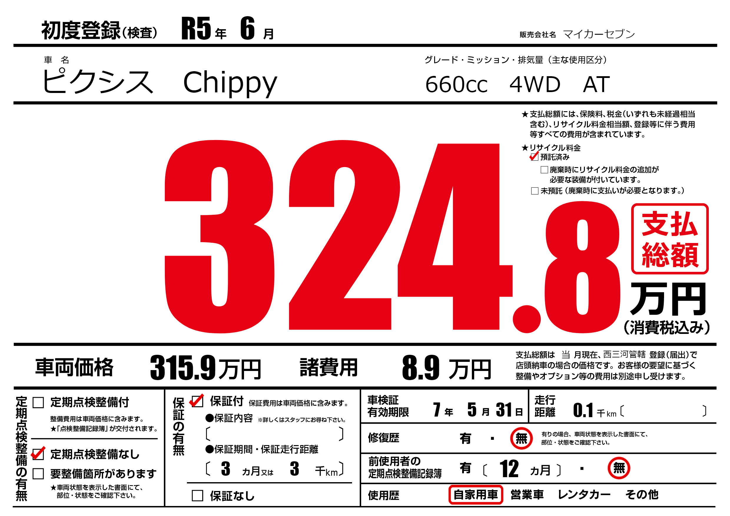 | 車名 | ピクシス Chippy | グレード ミッション 排気量 |