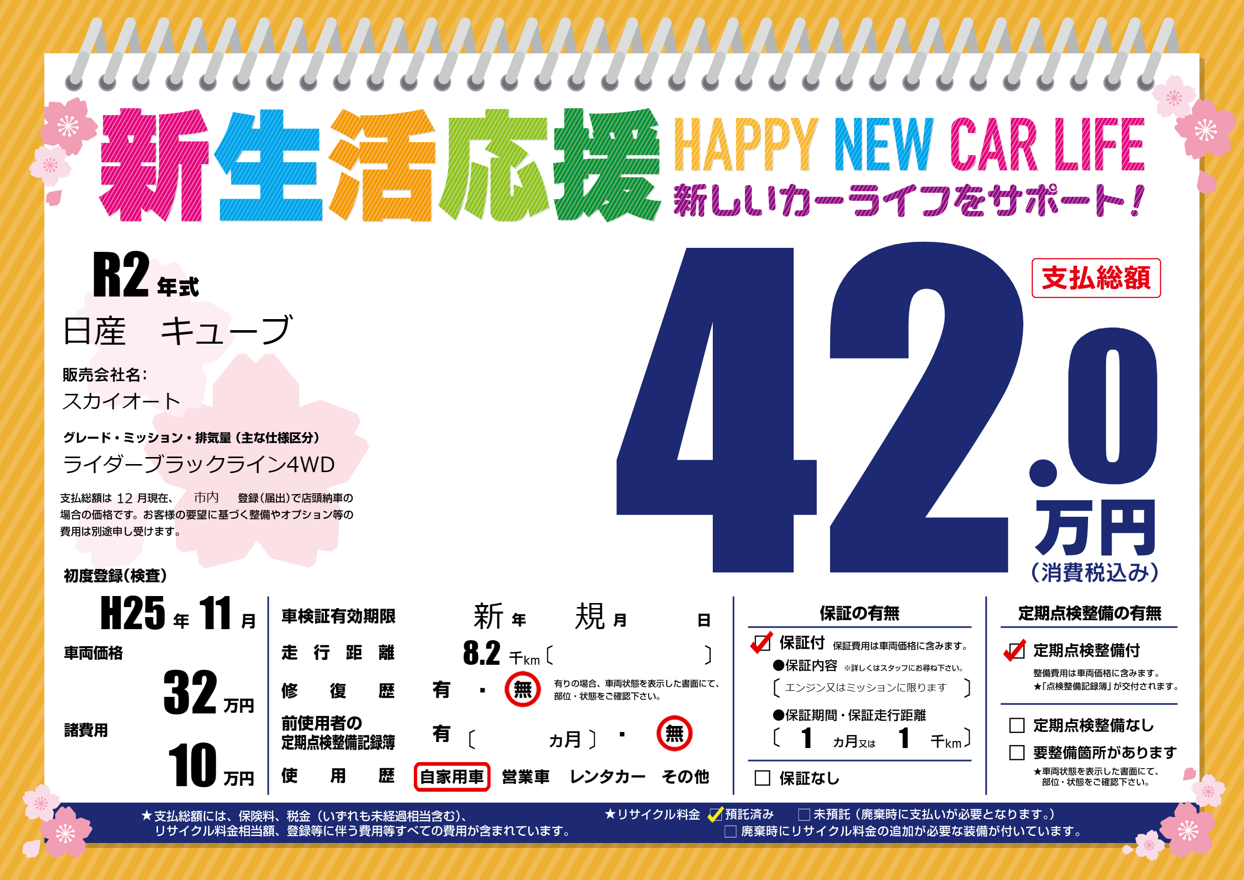 | 車名 | 日産 キューブ | グレード ミッション 排気量 |