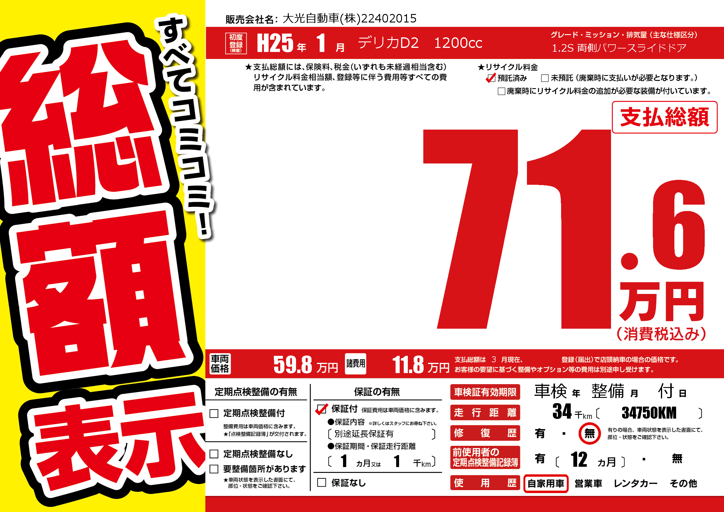 | 車名 | デリカD2 1200cc | グレード ミッション 排気量 |