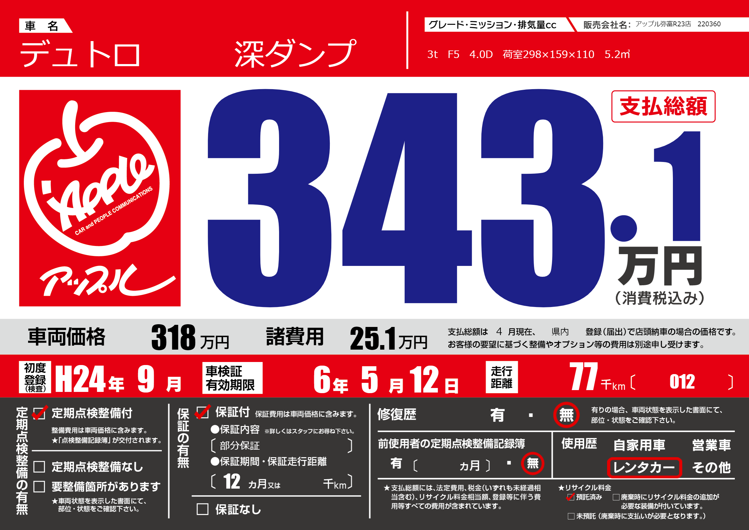 | 走行キロ | 7.7万km | 初年度登録 | H24年9月 |