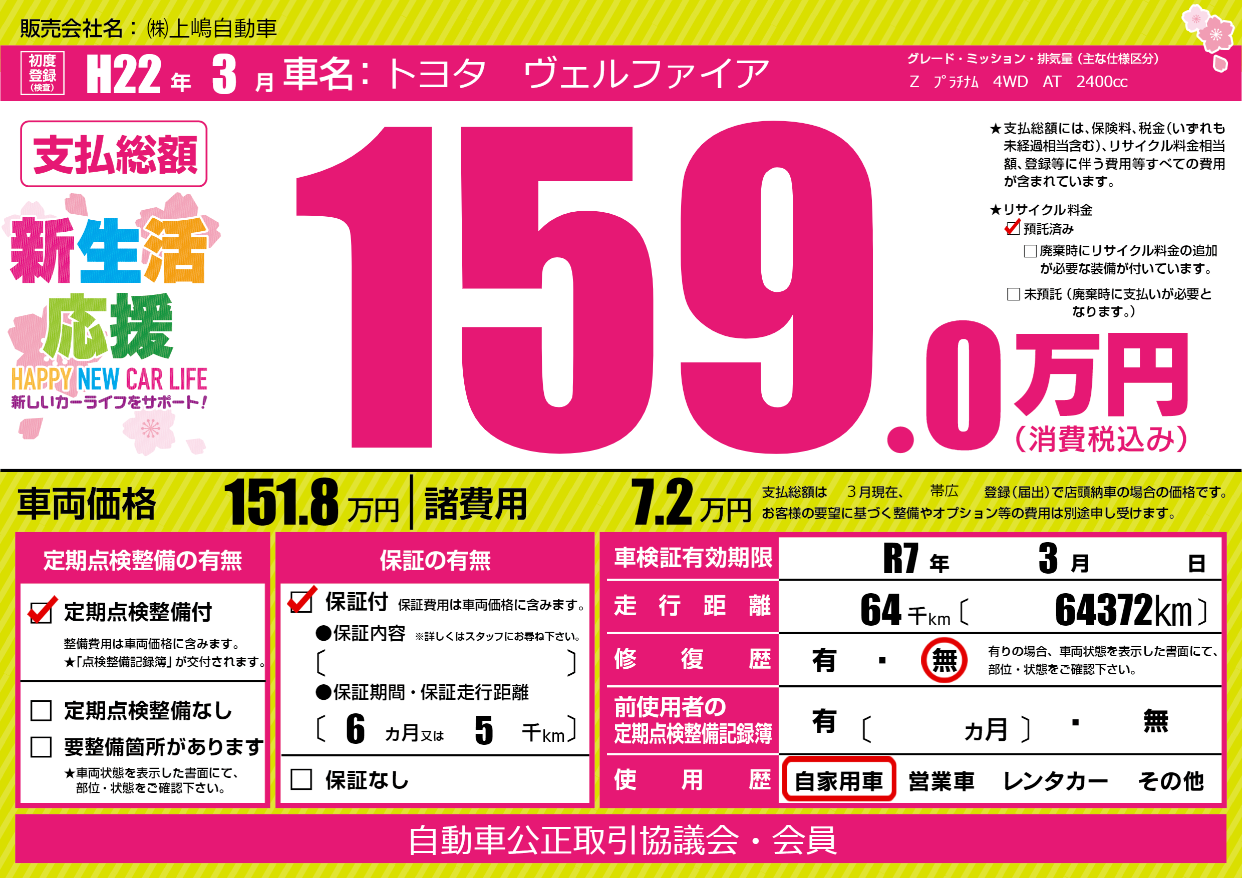 | 車名 | トヨタ ヴェルファイア | グレード ミッション 排気量 |