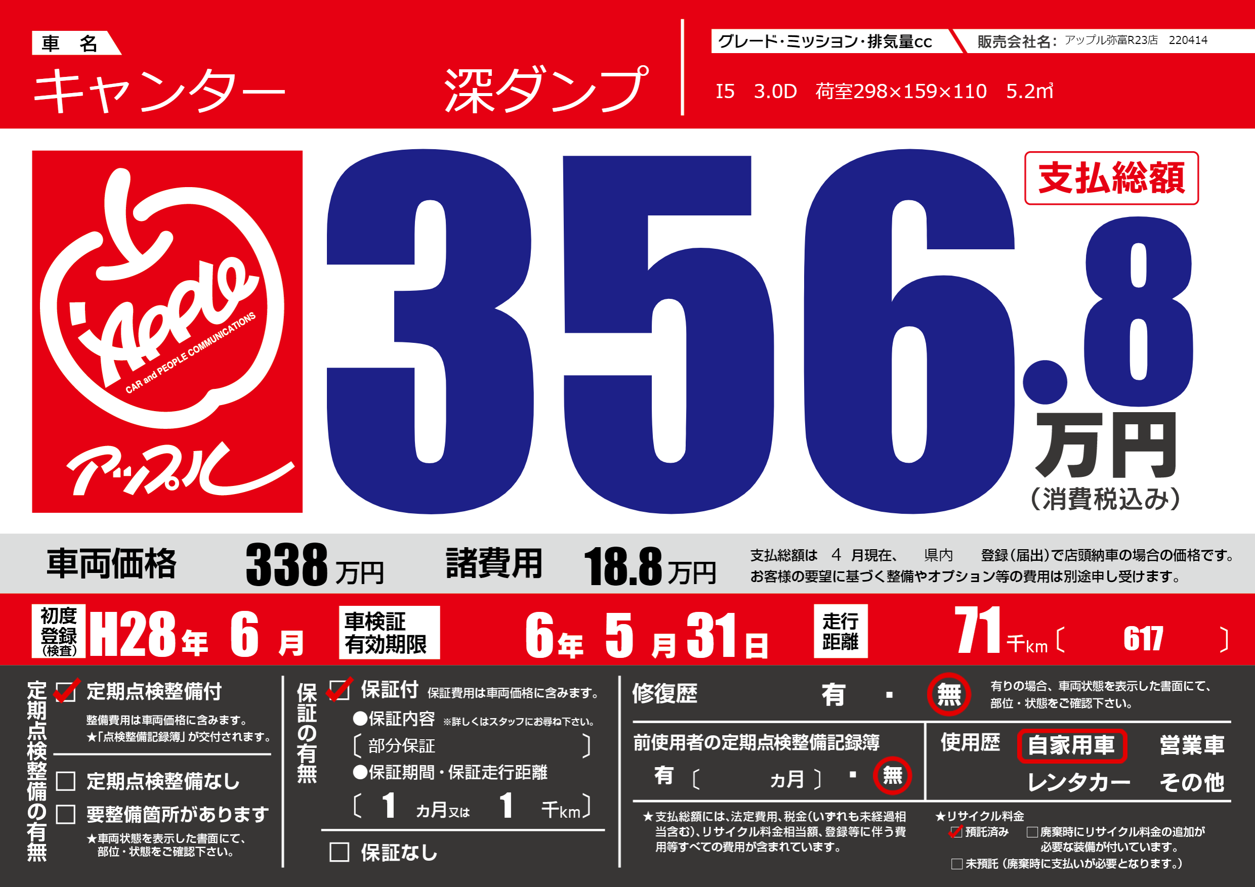 | 車名 | キャンター 深ダンプ | グレード ミッション 排気量 |