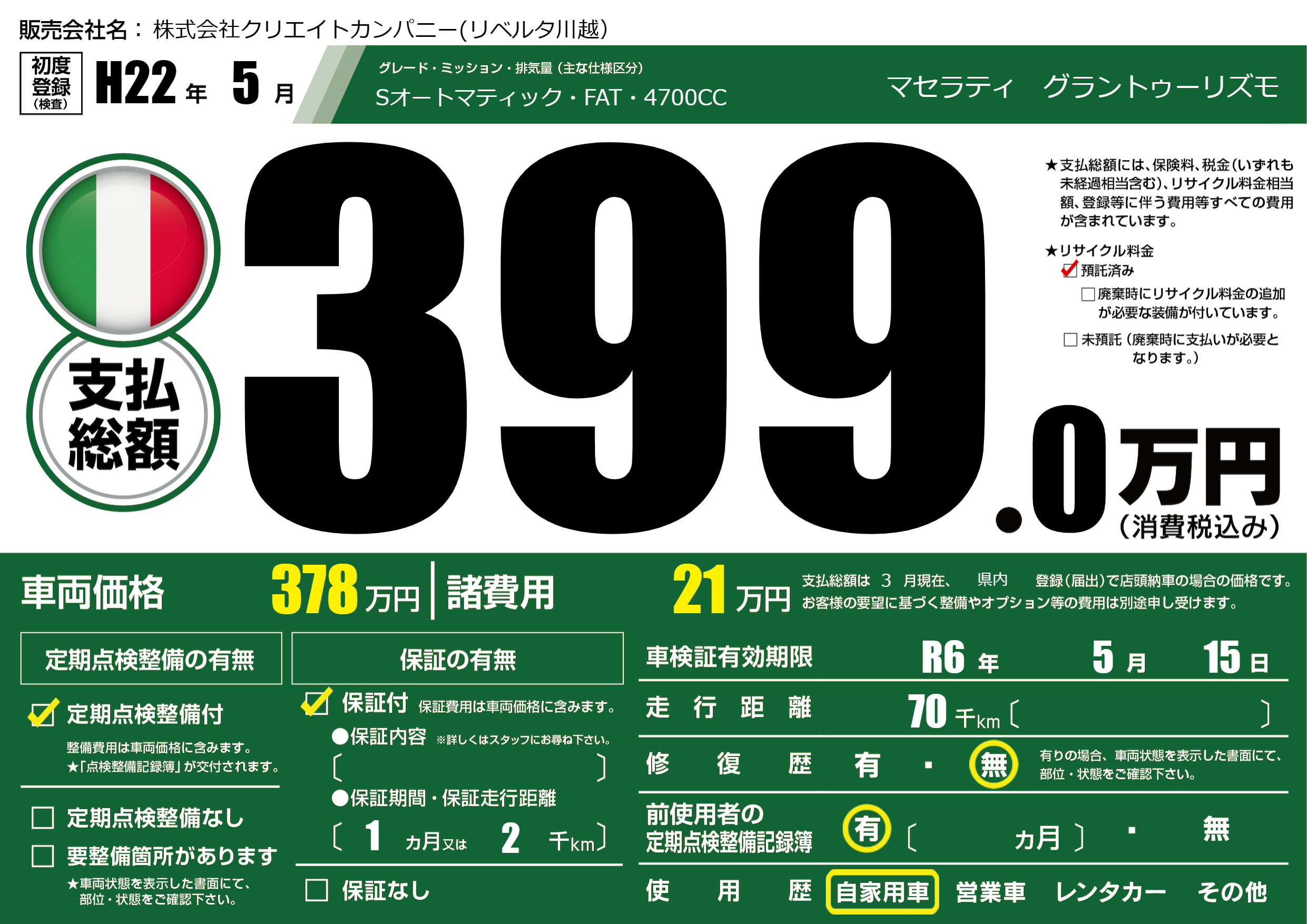 | 車名 | マセラティ グラントゥーリズモ | グレード ミッション 排気量 |