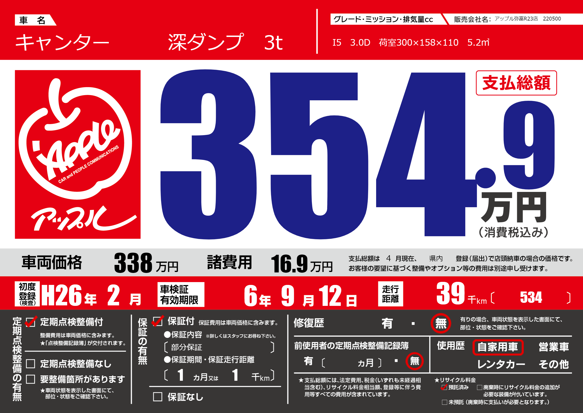 | 車名 | キャンター 深ダンプ 3t | グレード ミッション 排気量 |