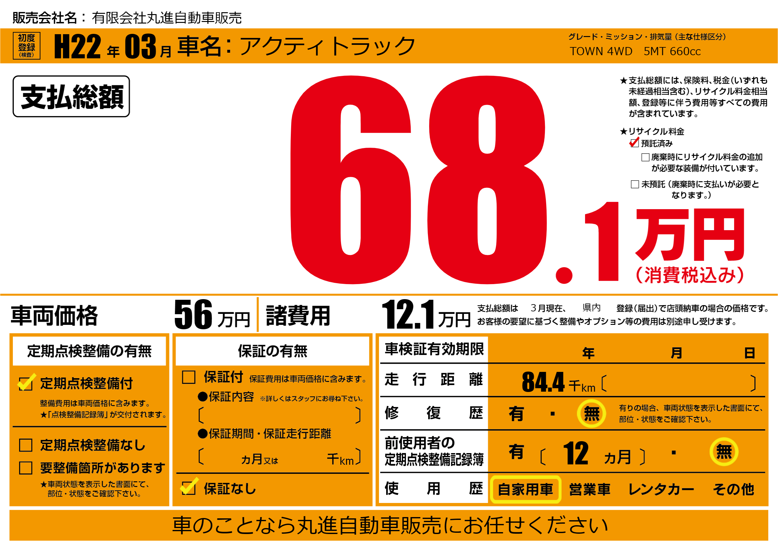 | 車名 | アクティトラック | グレード ミッション 排気量 |