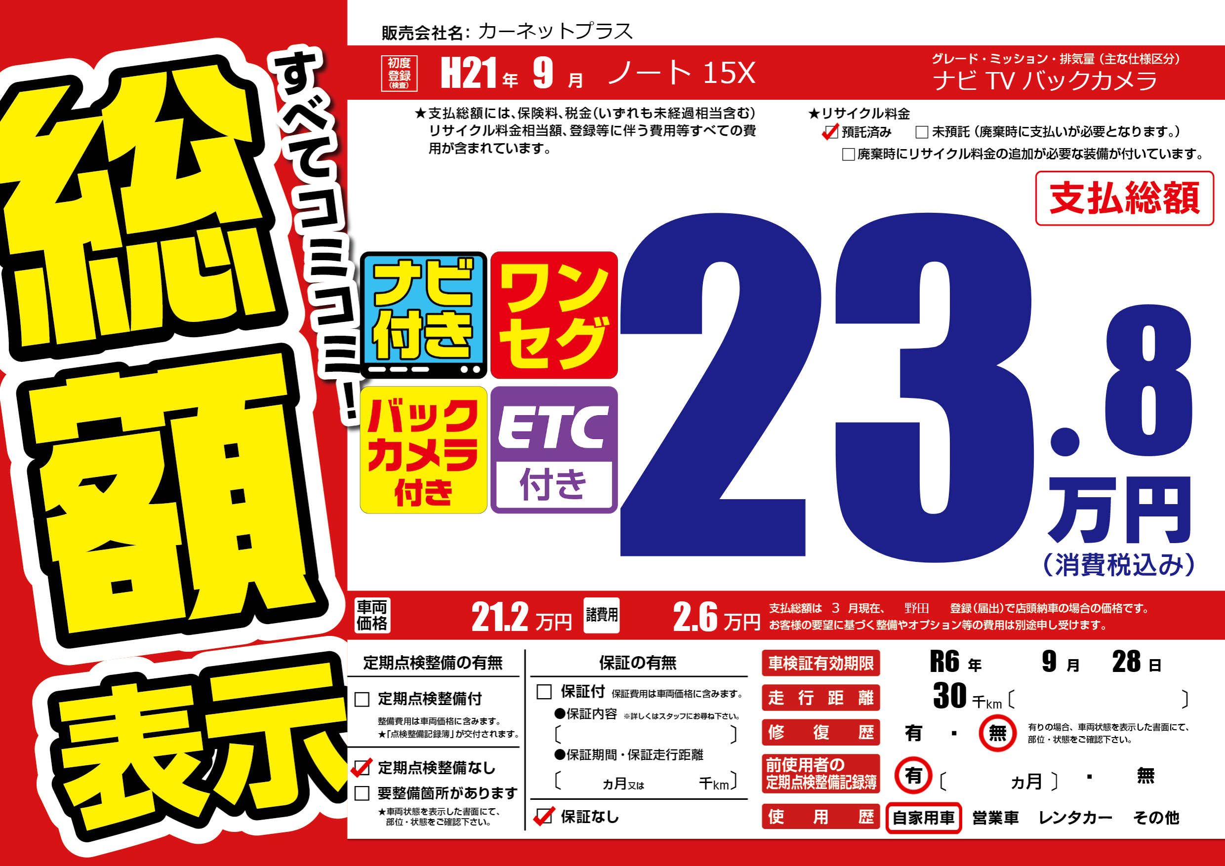 | 走行キロ | 3万km | 初年度登録 | H21年9月 |
