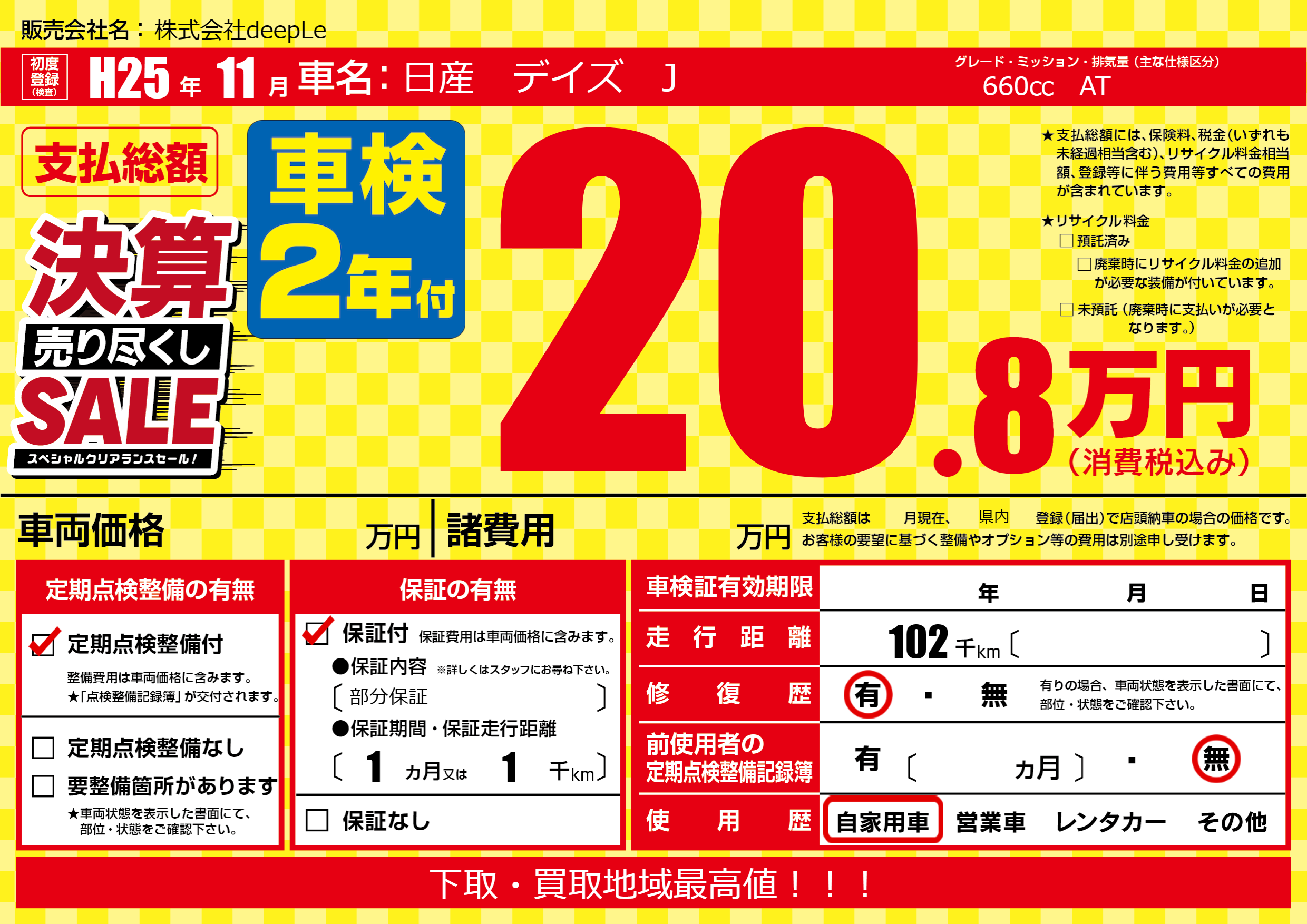 | 車名 | 日産 デイズ J | グレード ミッション 排気量 |
