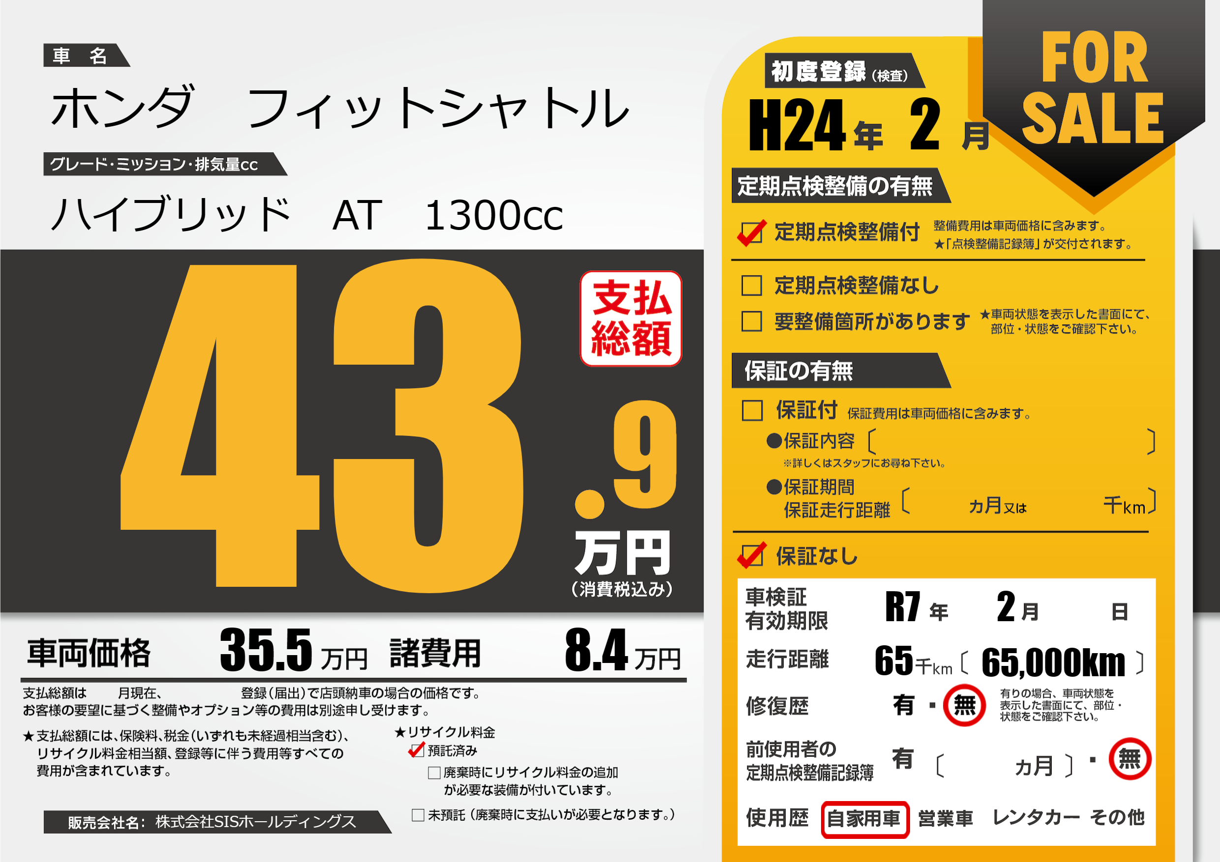 | 車検制限 | R7年 2月 - 日 | ||