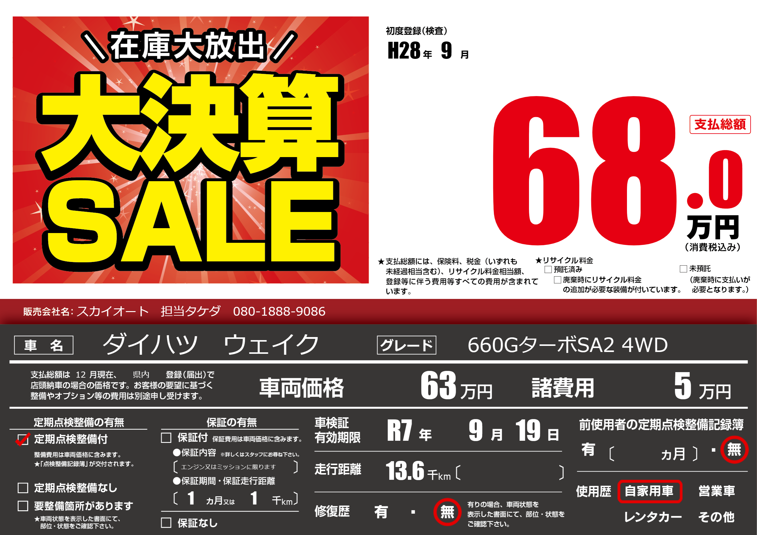 | 車名 | ダイハツ ウェイク | グレード ミッション 排気量 |