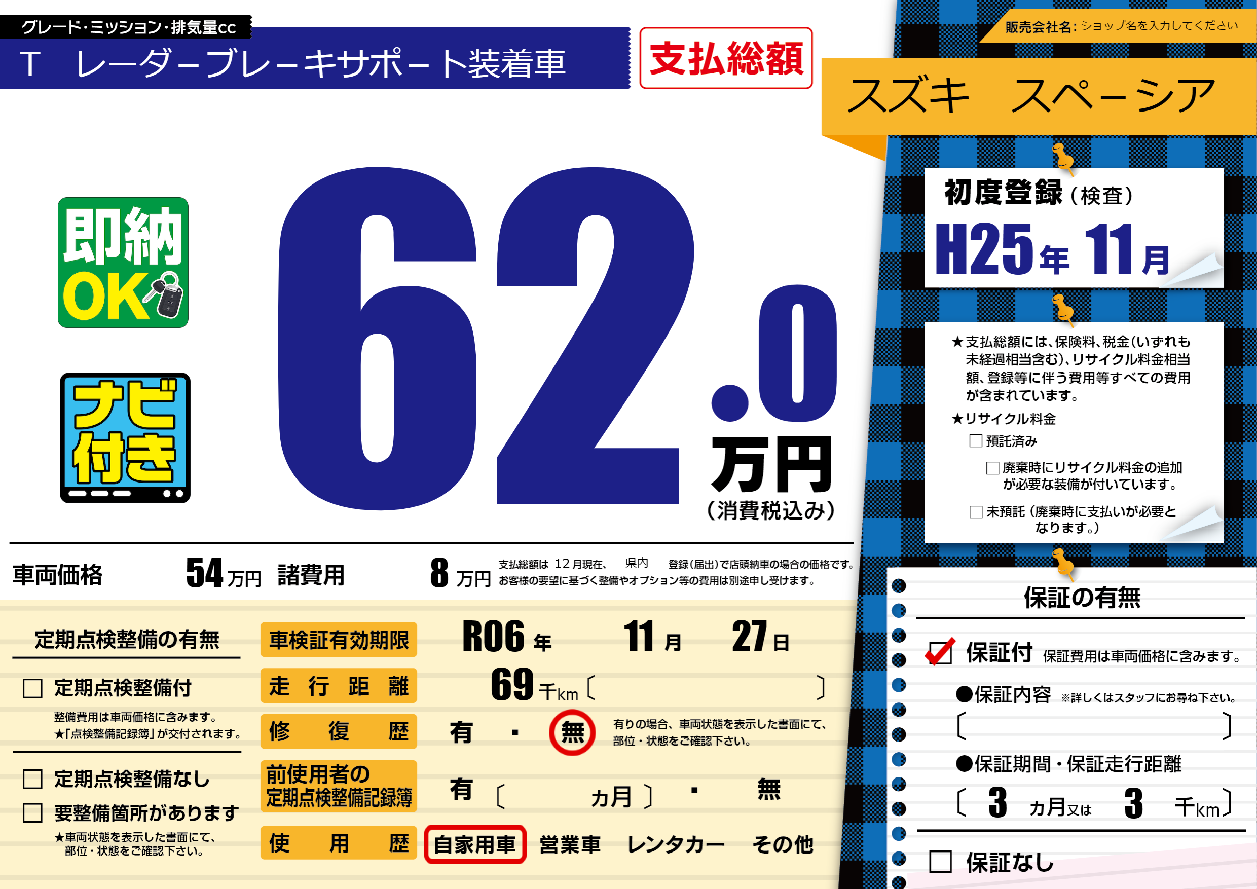 | 車名 | スズキ スペ-シア | グレード ミッション 排気量 |