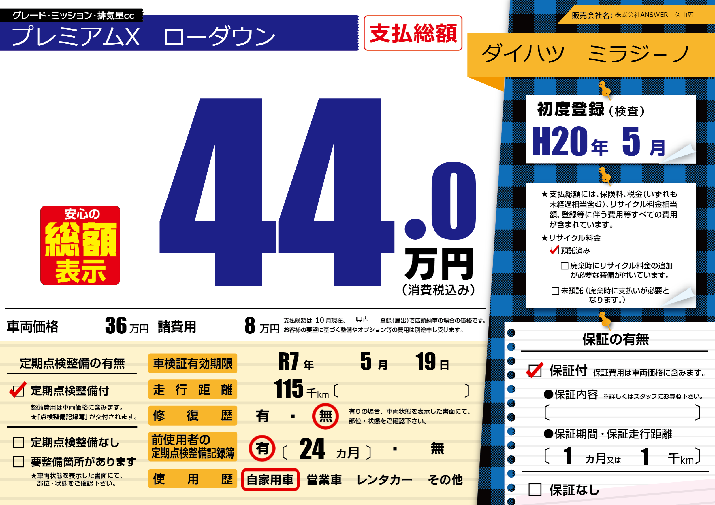 | 車名 | ダイハツ ミラジ-ノ | グレード ミッション 排気量 |