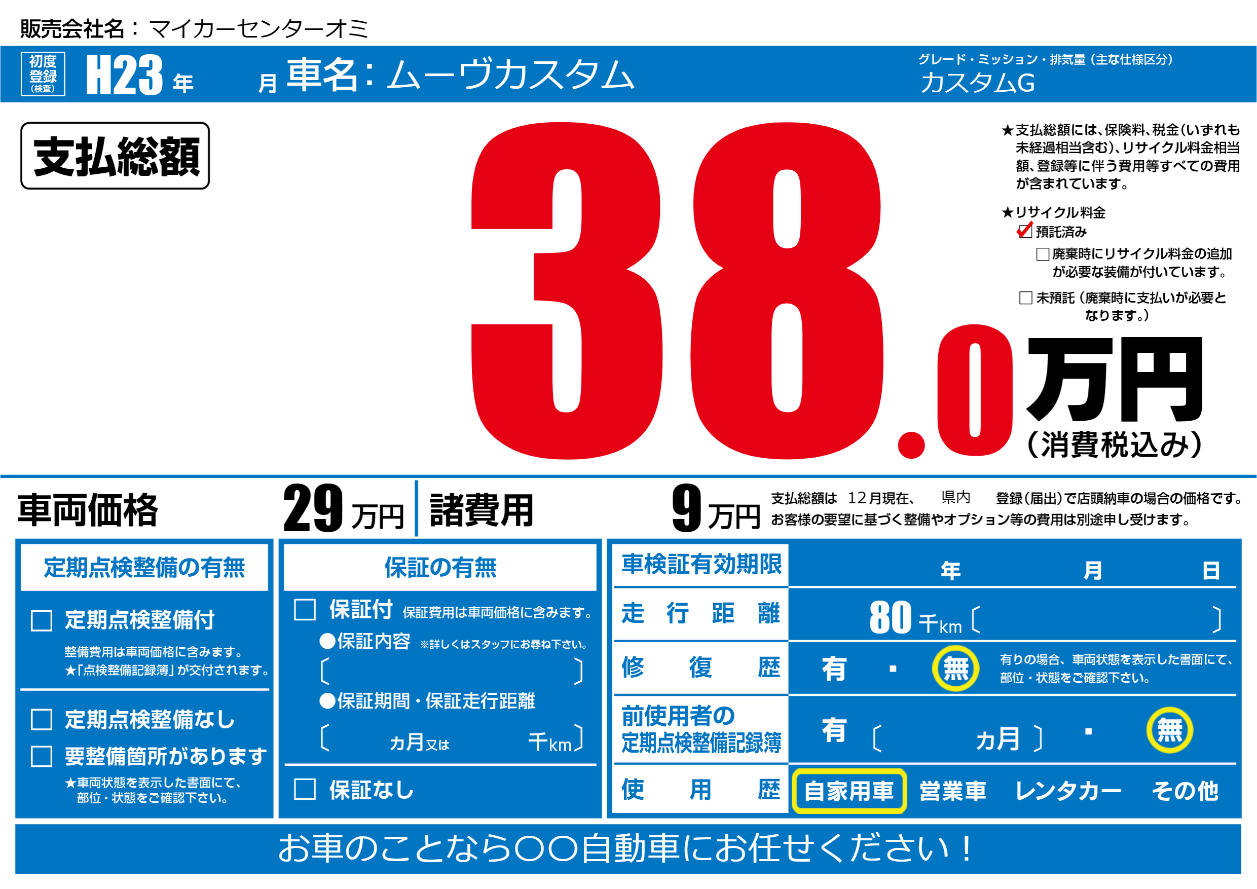 | 走行キロ | 8万km | 初年度登録 | H23年---月 |