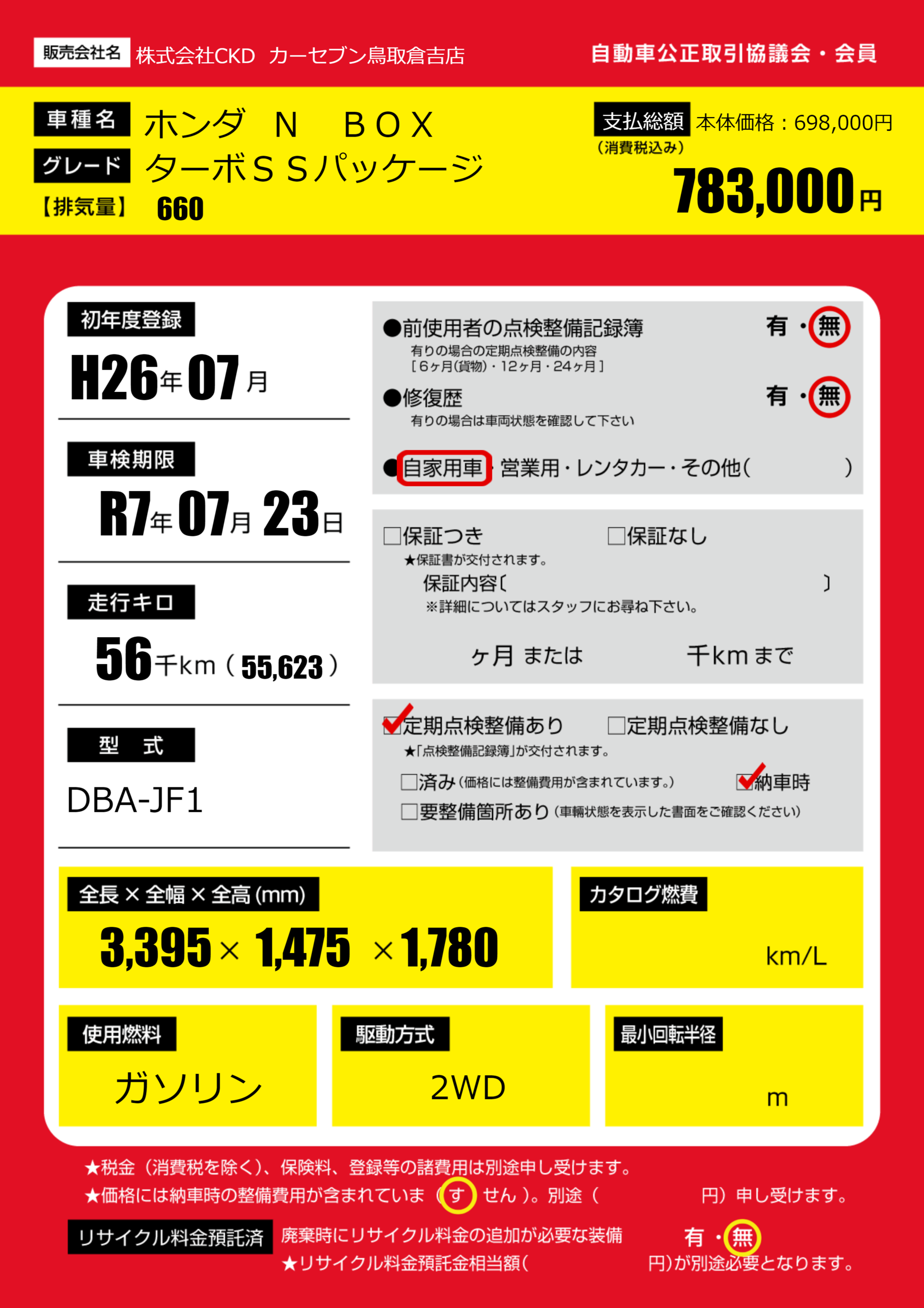 | 車名 | ホンダ N BOX | グレード ミッション 排気量 |