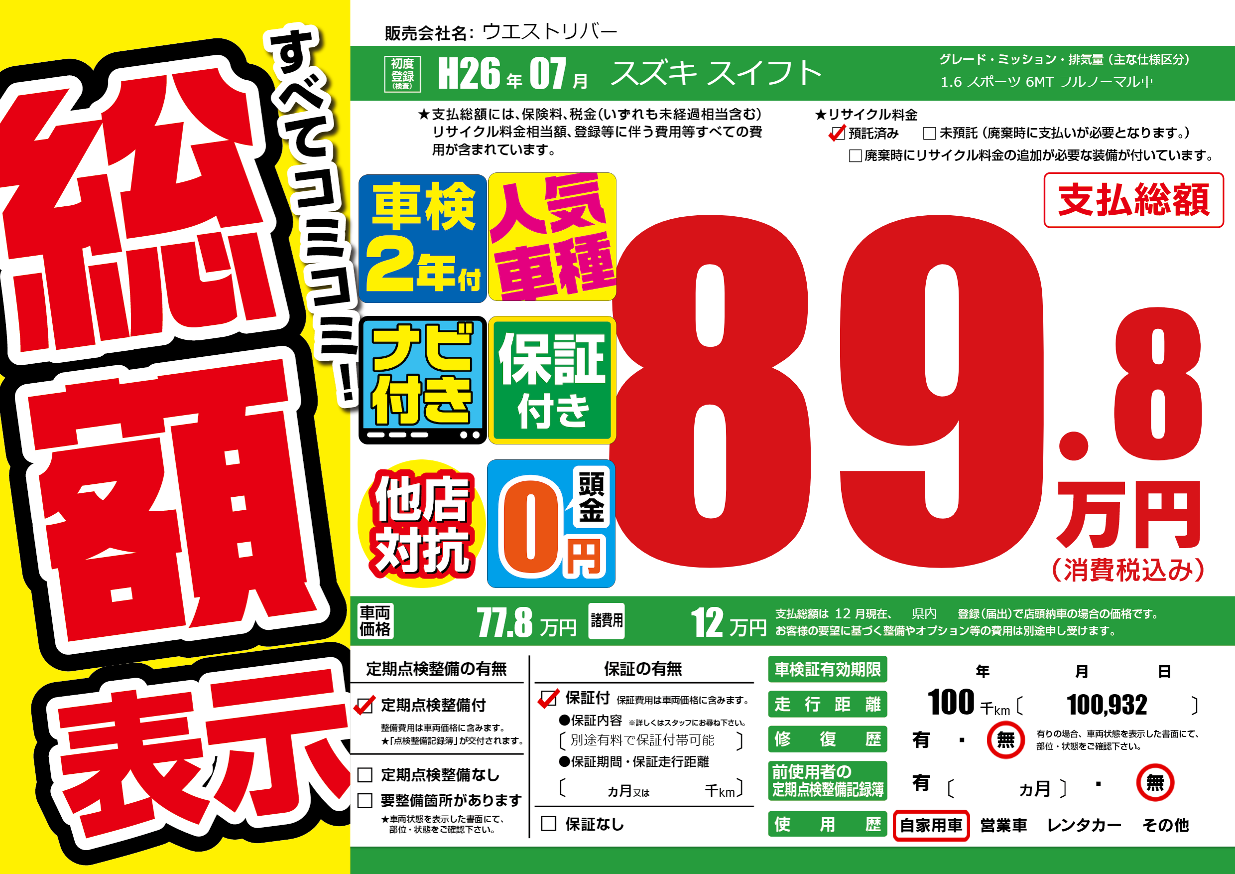 | 走行キロ | 10万km | 初年度登録 | H26年07月 |
