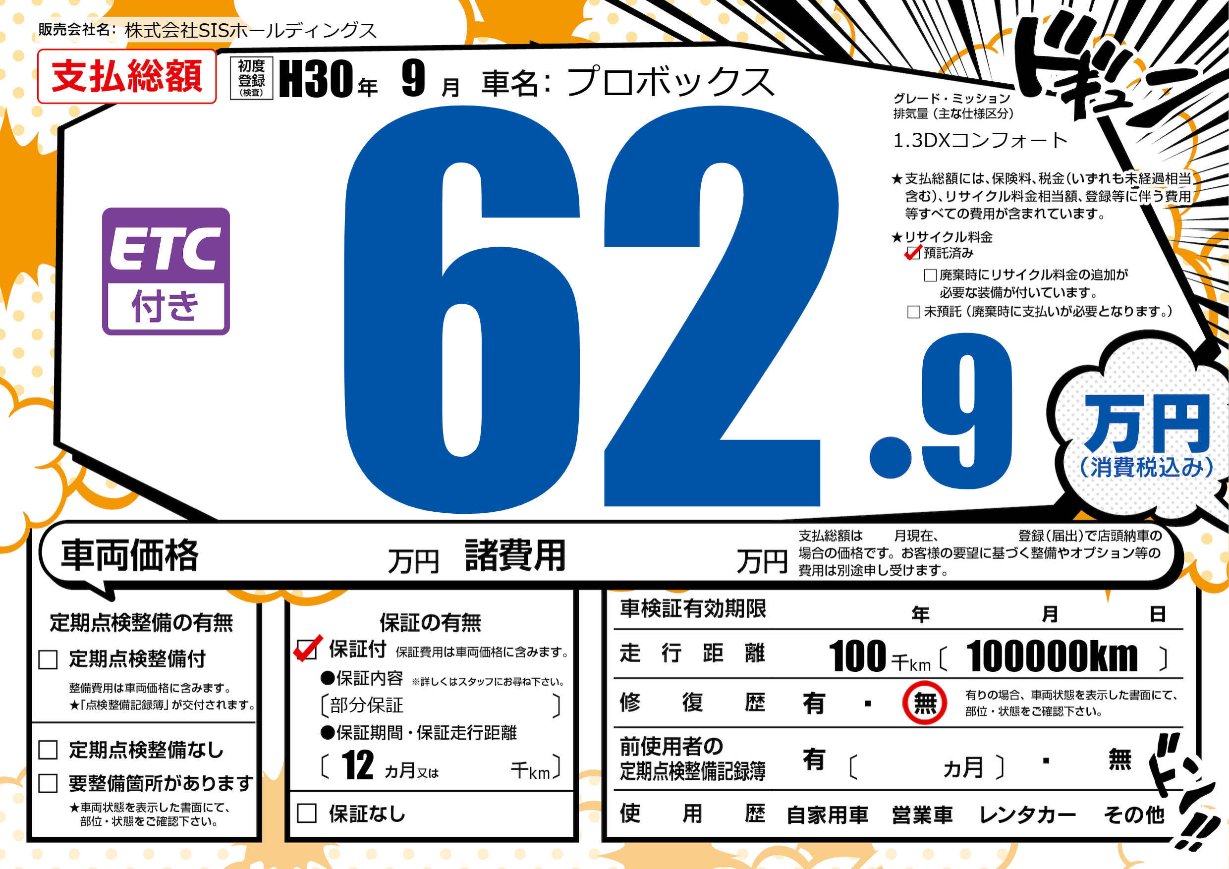 | 走行キロ | 10万km | 初年度登録 | H30年9月 |