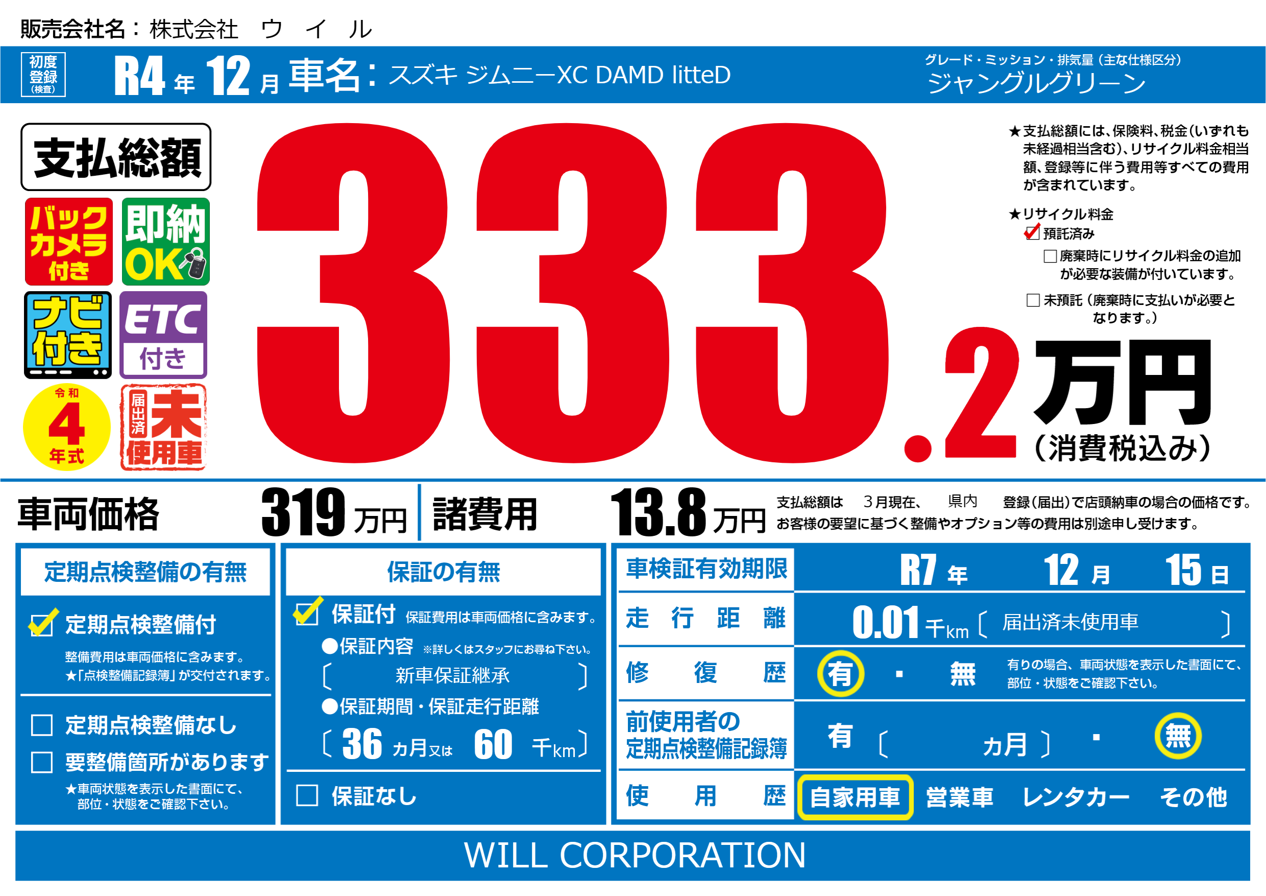 | 車検制限 | R7年 12月 15日 | ||