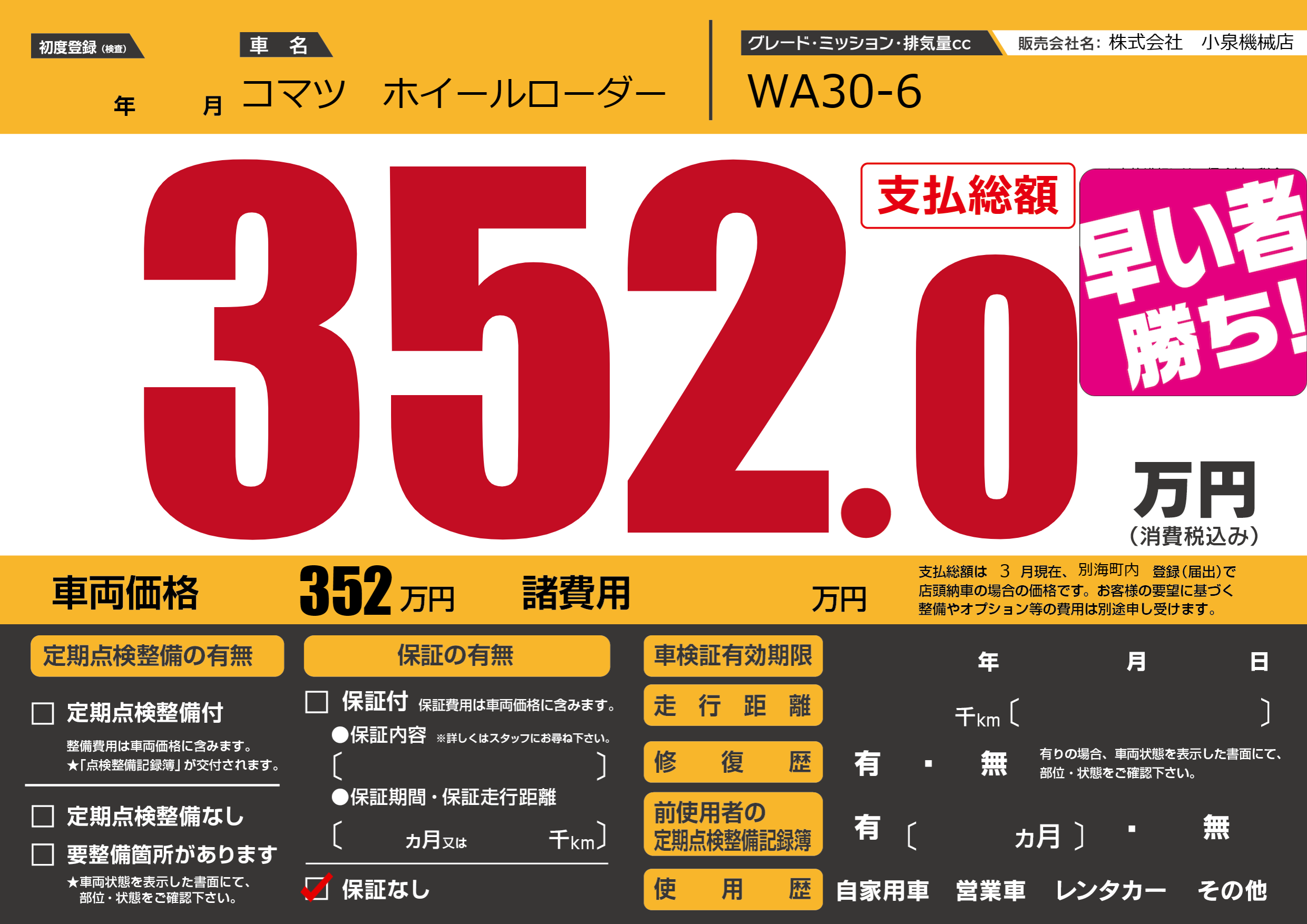 | 車名 | コマツ ホイールローダー | グレード ミッション 排気量 |