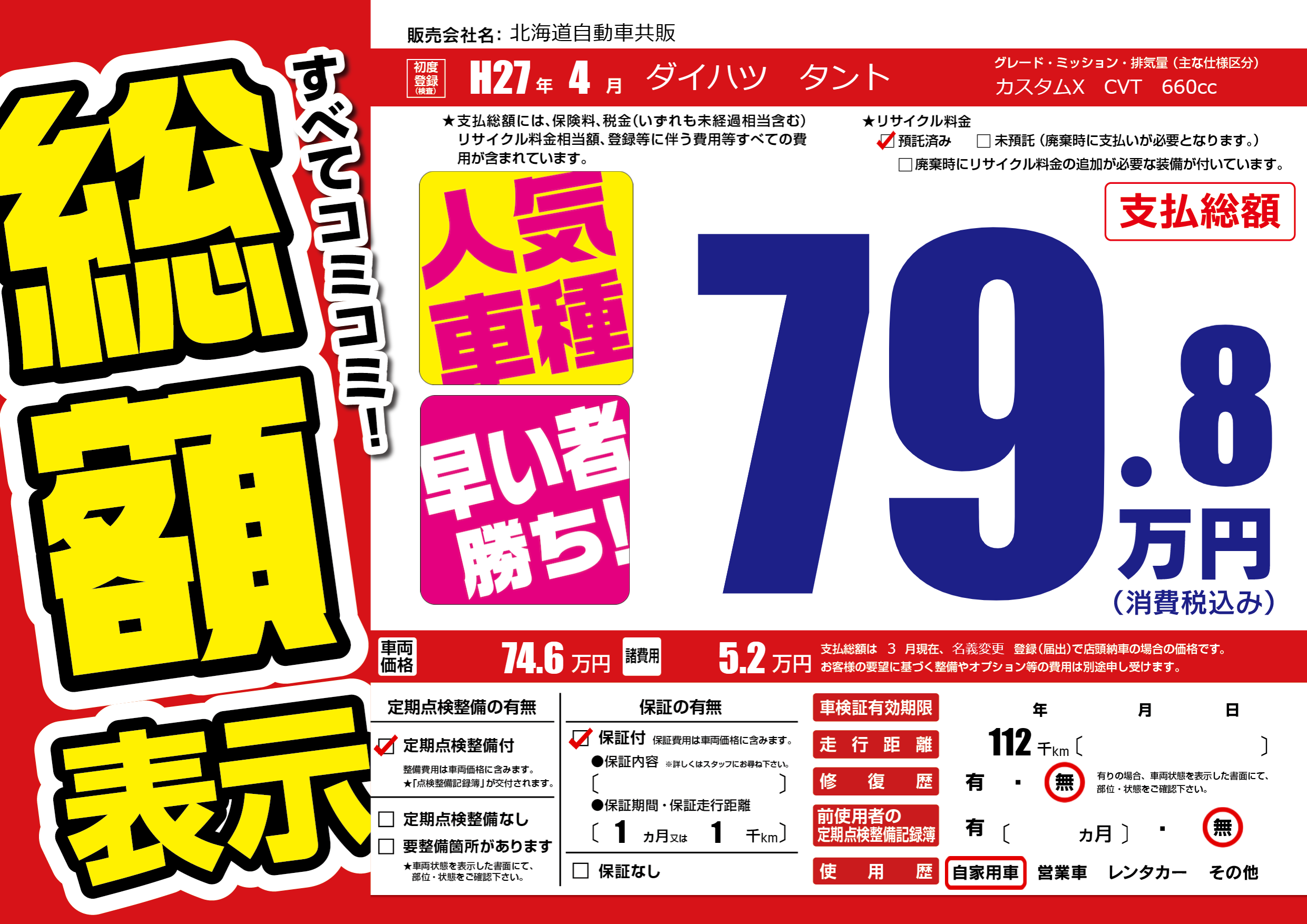 | 車名 | ダイハツ タント | グレード ミッション 排気量 |