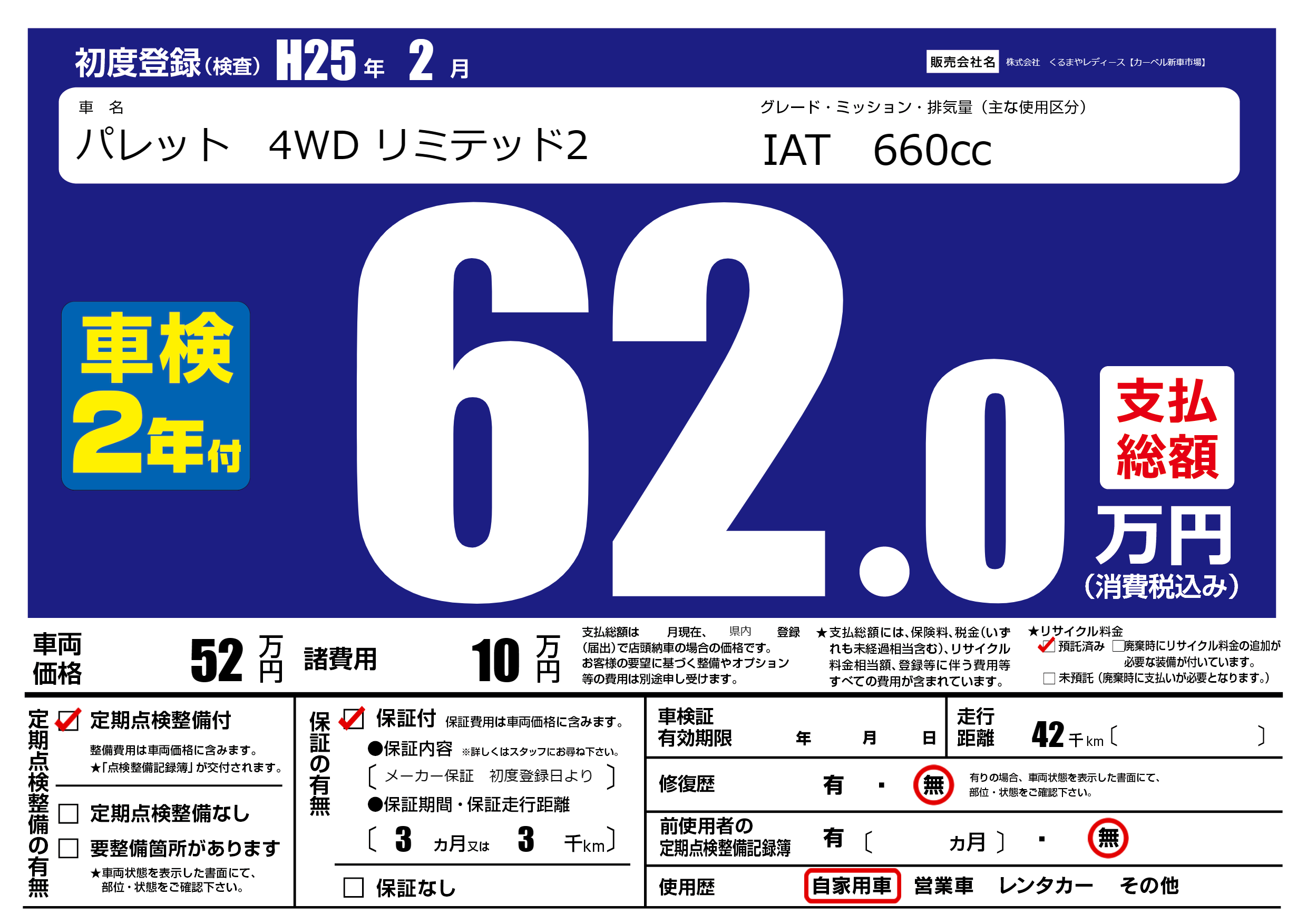 | 車名 | パレット 4WD リミテッド2 | グレード ミッション 排気量 |