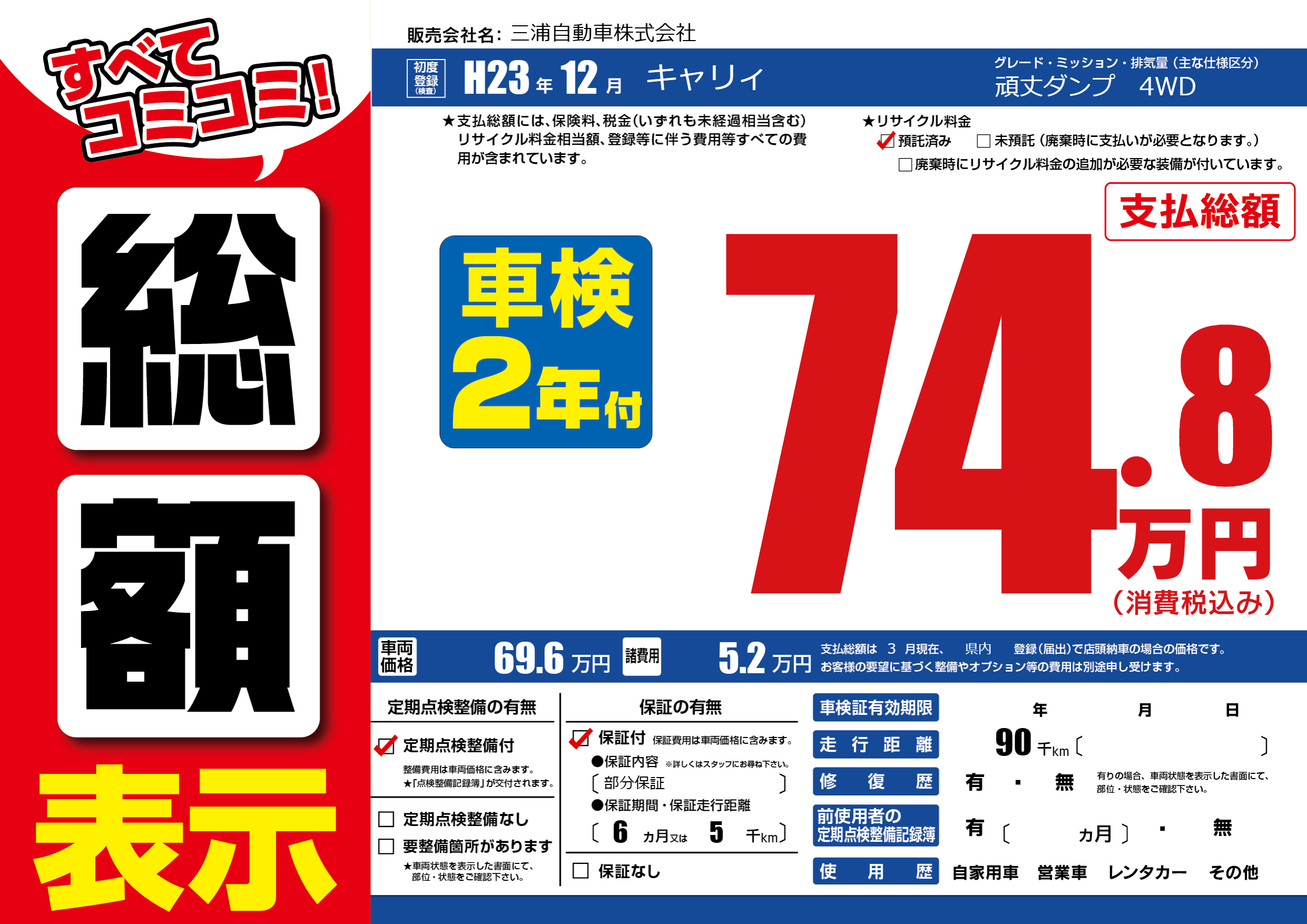 | 走行キロ | 9万km | 初年度登録 | H23年12月 |