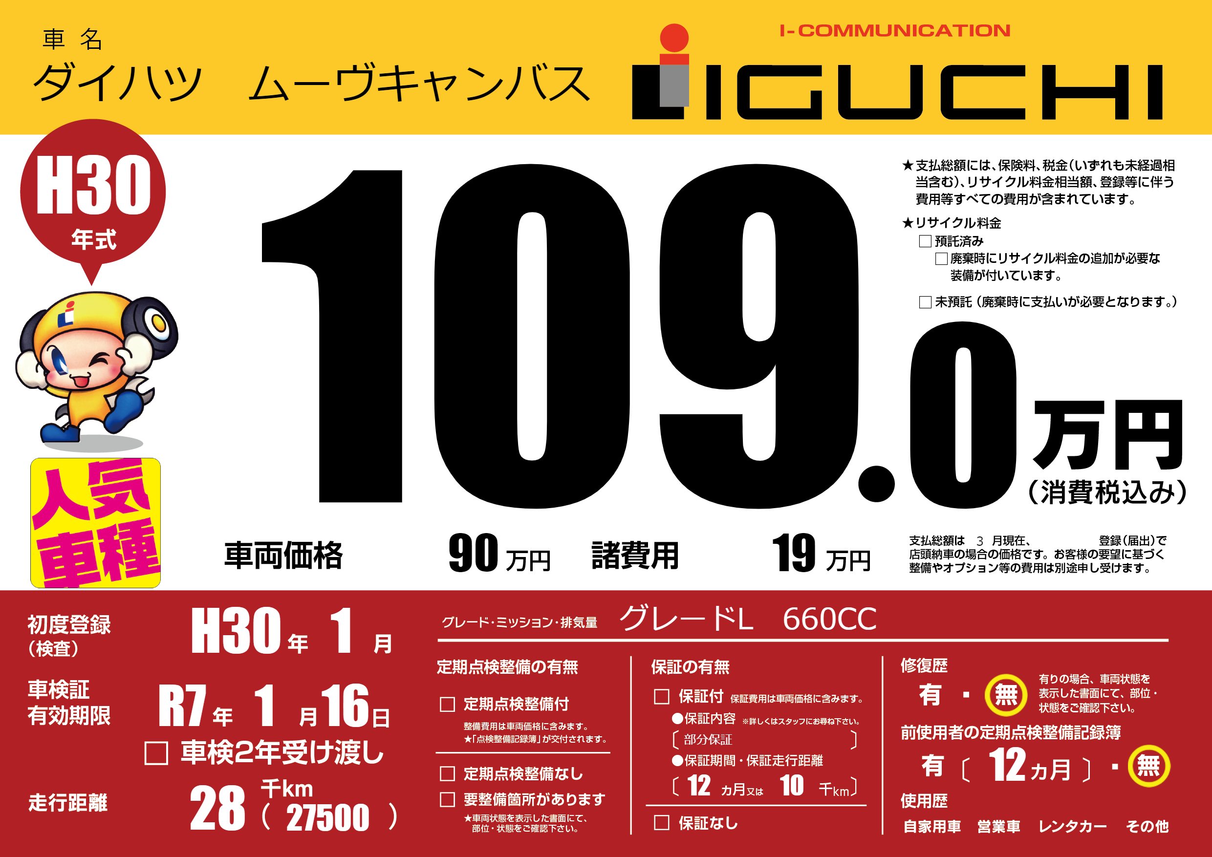 | 車名 | ダイハツ ムーヴキャンバス | グレード ミッション 排気量 |