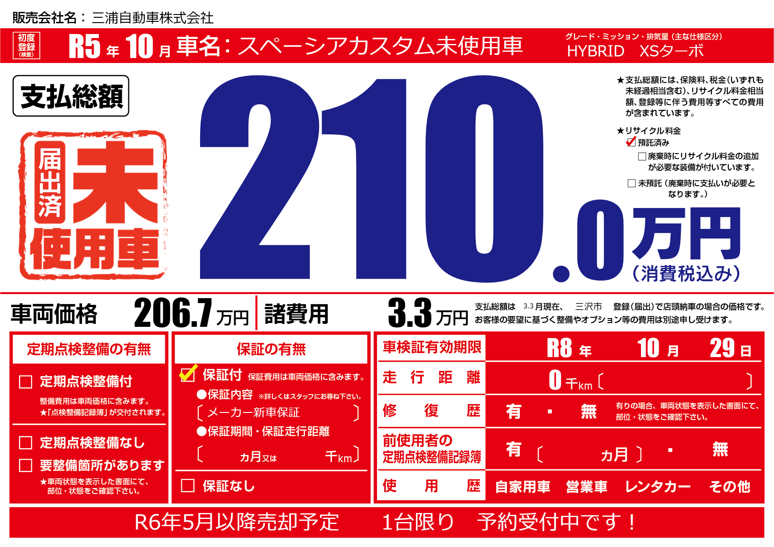 | 車名 | スペーシアカスタム未使用車 | グレード ミッション 排気量 |