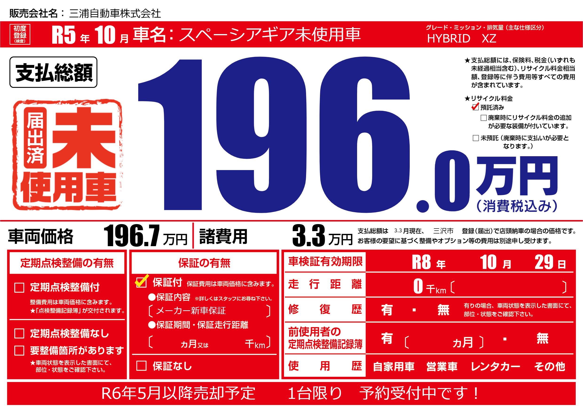 | 車名 | スペーシアギア未使用車 | グレード ミッション 排気量 |