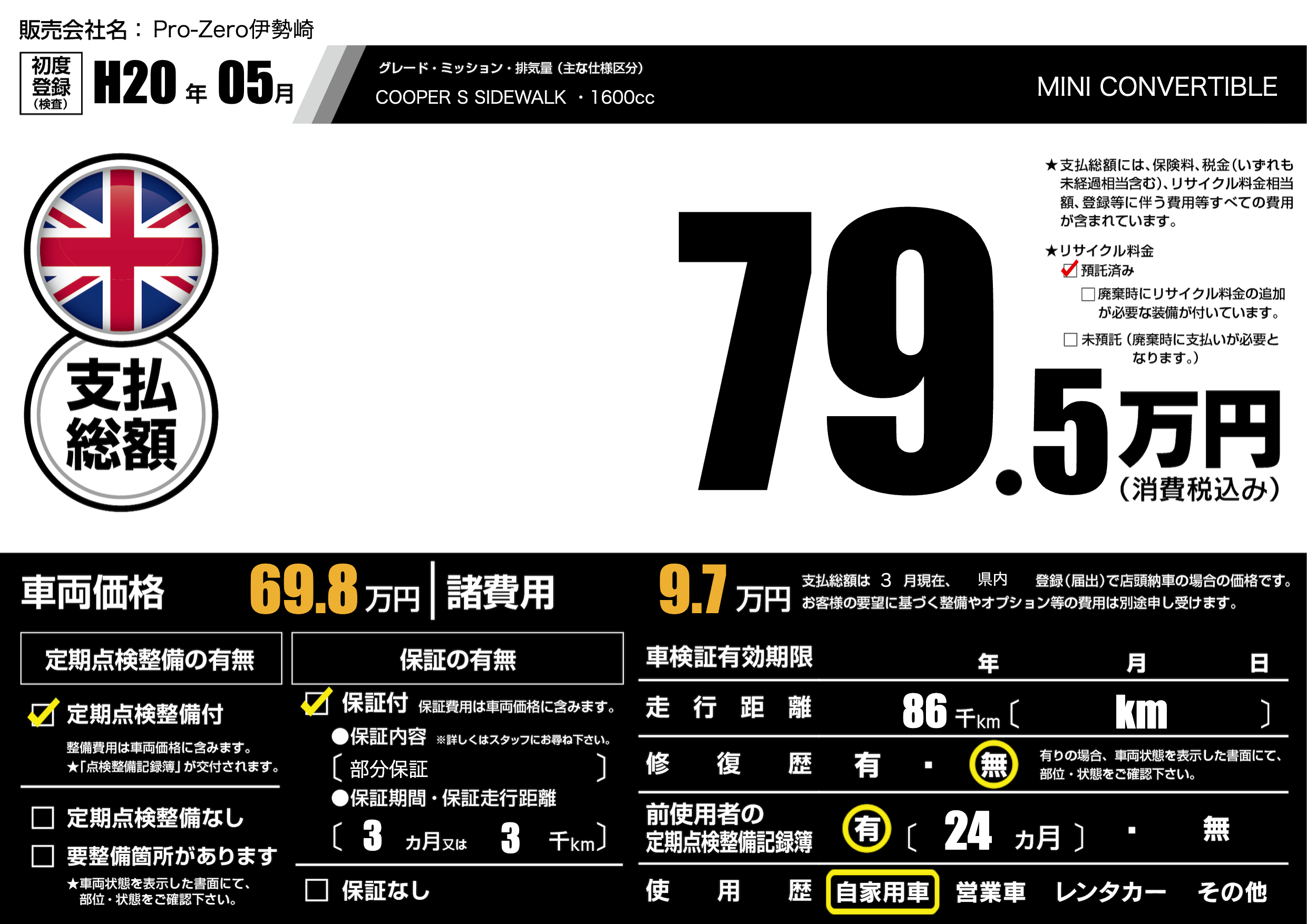 | 車名 | MINI CONVERTIBLE | グレード ミッション 排気量 |