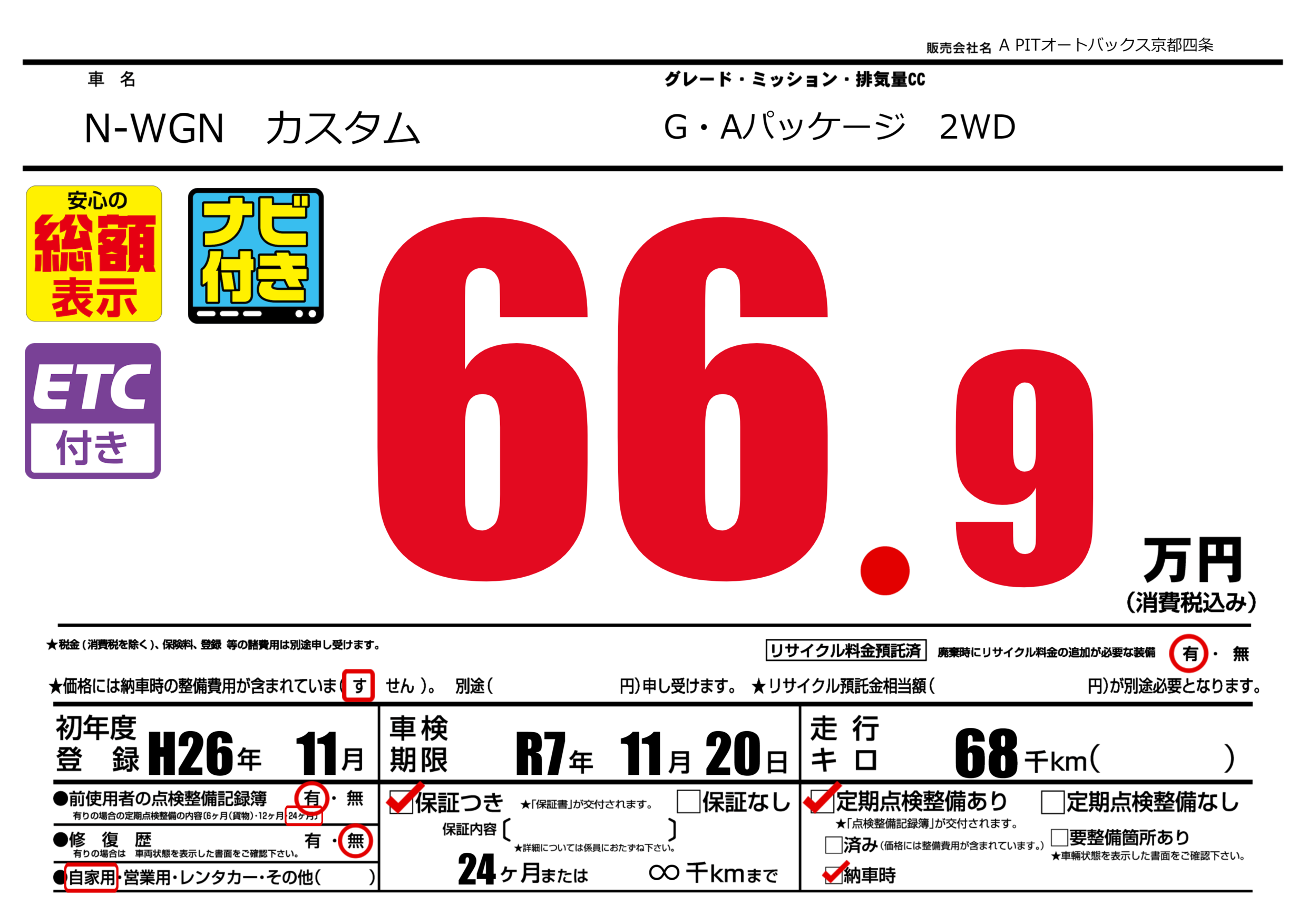 | 車名 | N-WGN カスタム | グレード ミッション 排気量 |