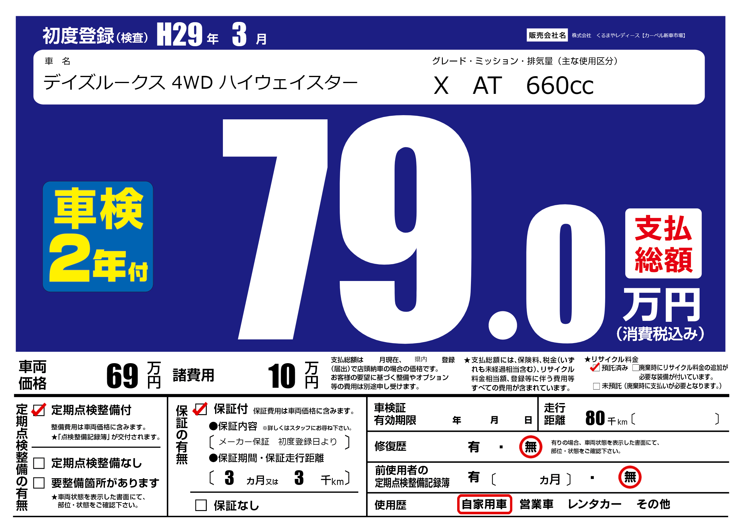 | 走行キロ | 8万km | 初年度登録 | H29年3月 |