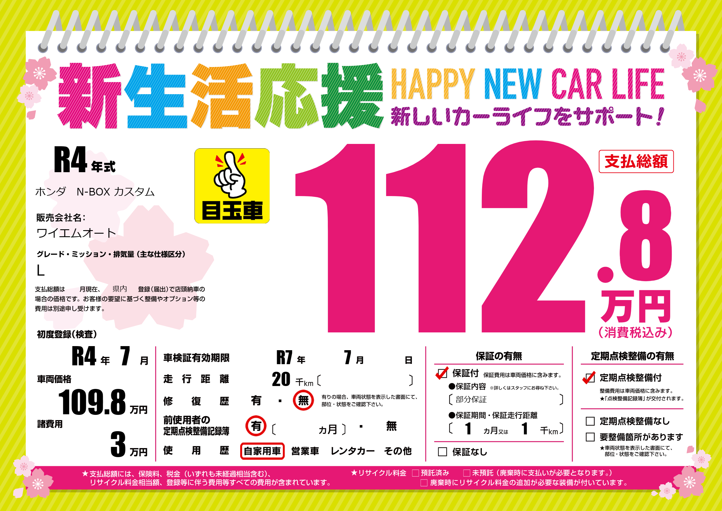 | 車名 | ホンダ N-BOX カスタム | グレード ミッション 排気量 |