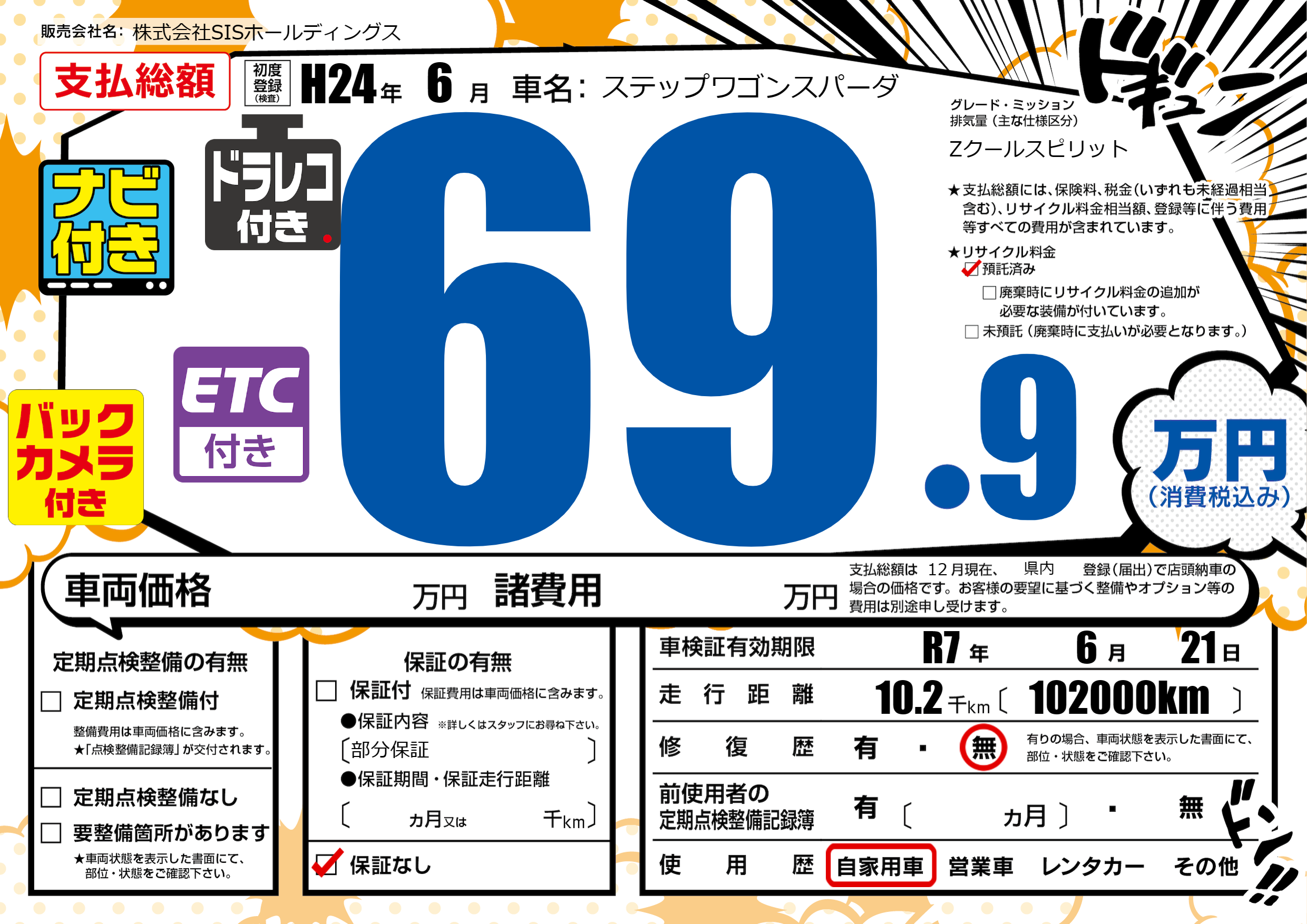 | 走行キロ | 1万km | 初年度登録 | H24年6月 |