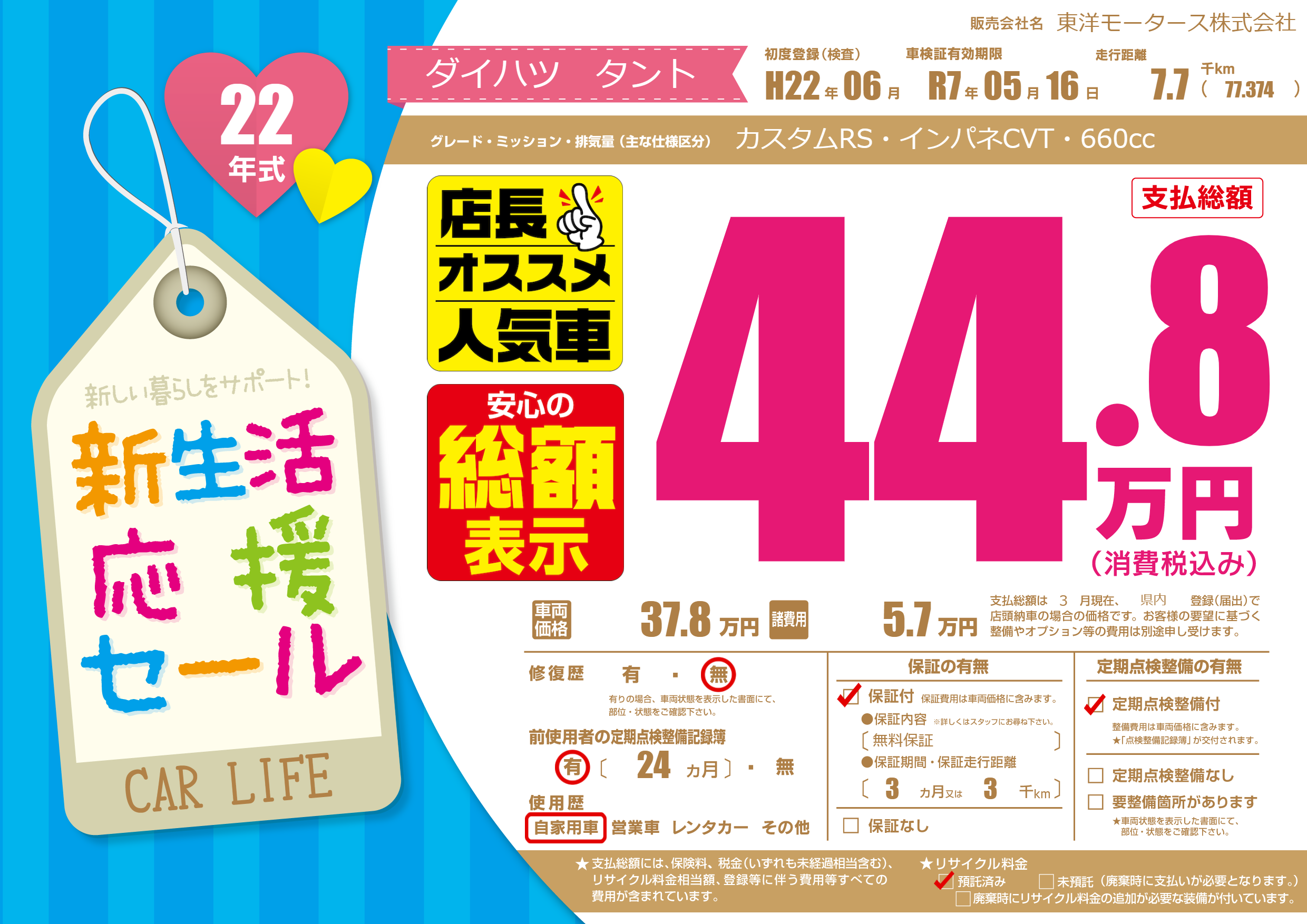| 車名 | ダイハツ タント | グレード ミッション 排気量 |