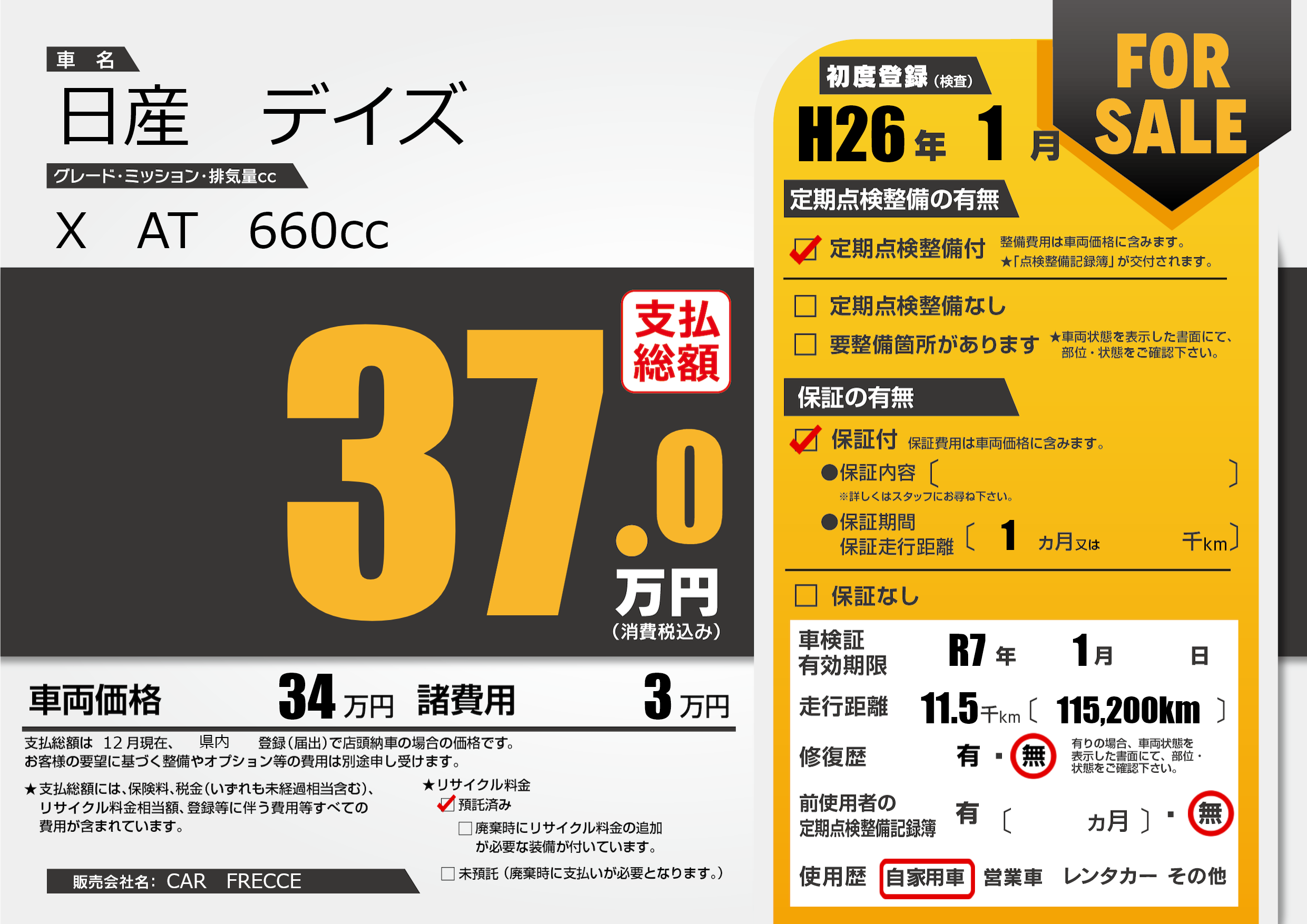 | 車名 | 日産 デイズ | グレード ミッション 排気量 |