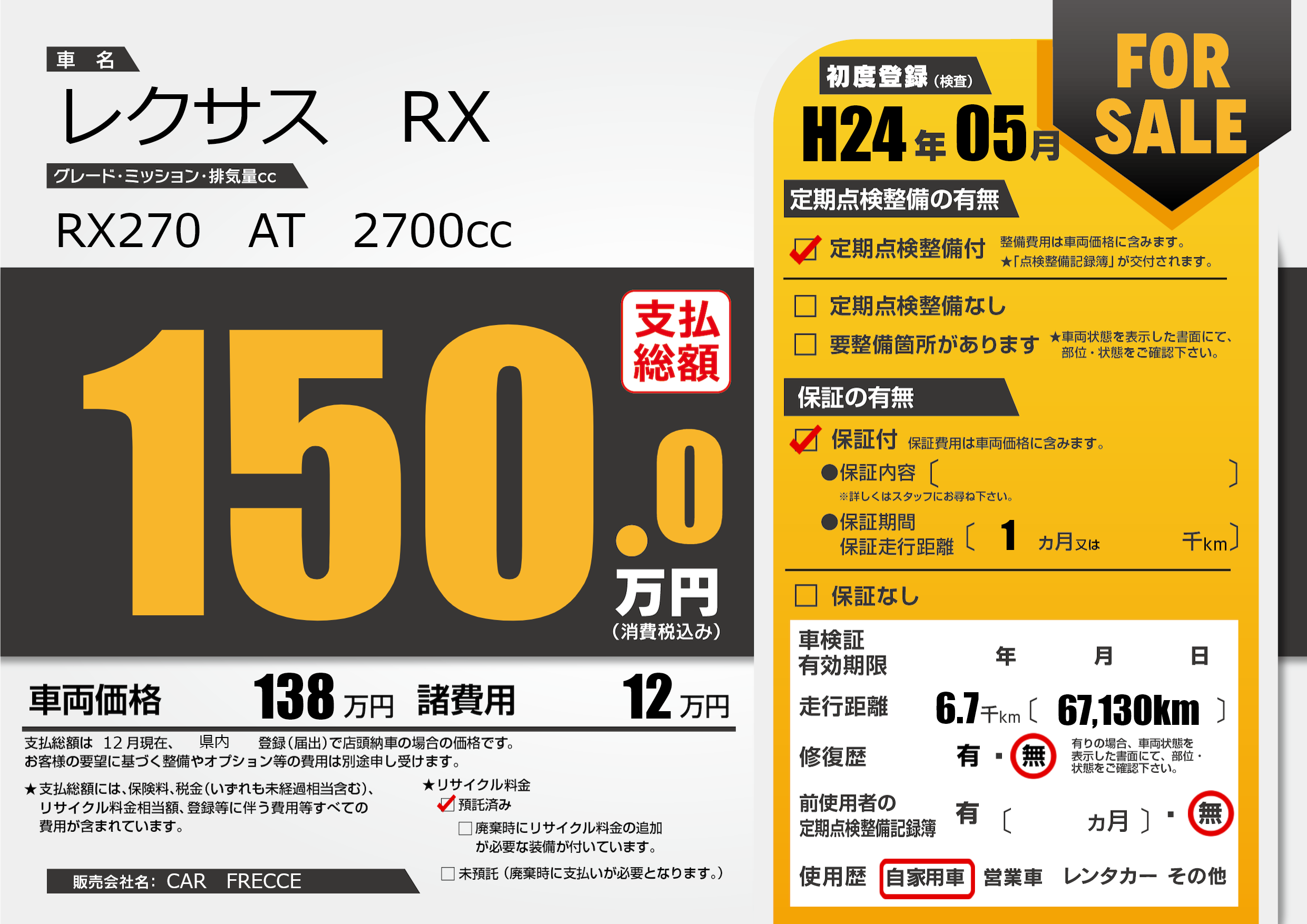 | 車名 | レクサス RX | グレード ミッション 排気量 |