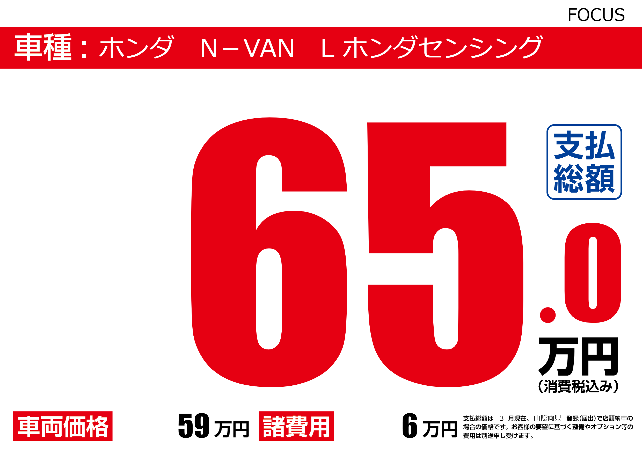 | 車名 | ホンダ N-VAN L ホンダセンシング | グレード ミッション 排気量 |