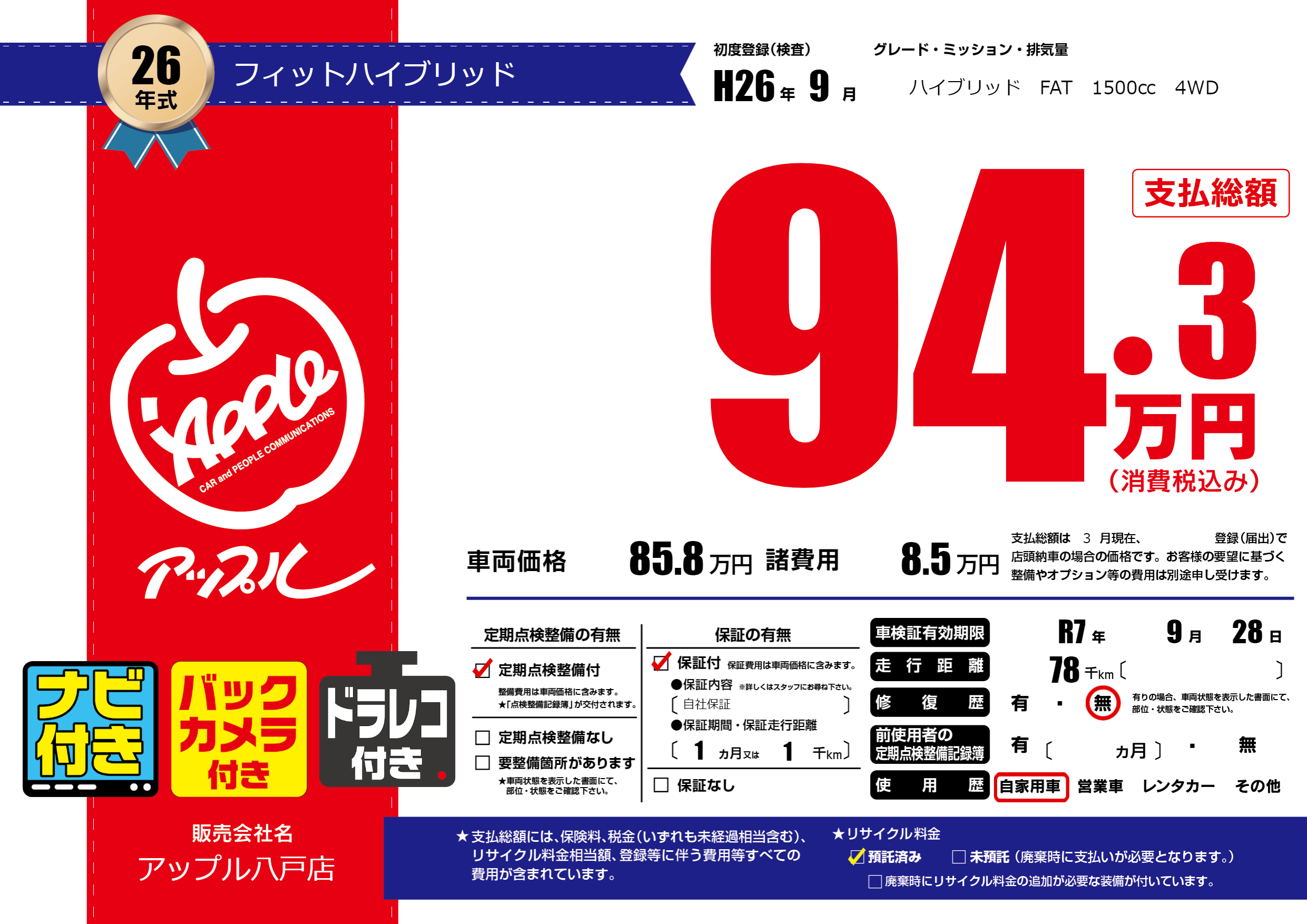 なし | 車検制限 | R7年9月28月 |
