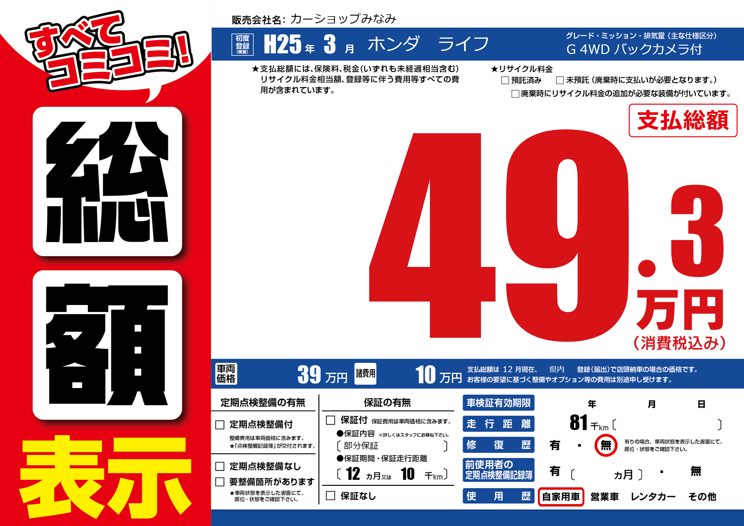 | 車名 | ホンダ ライフ | グレード ミッション 排気量 |