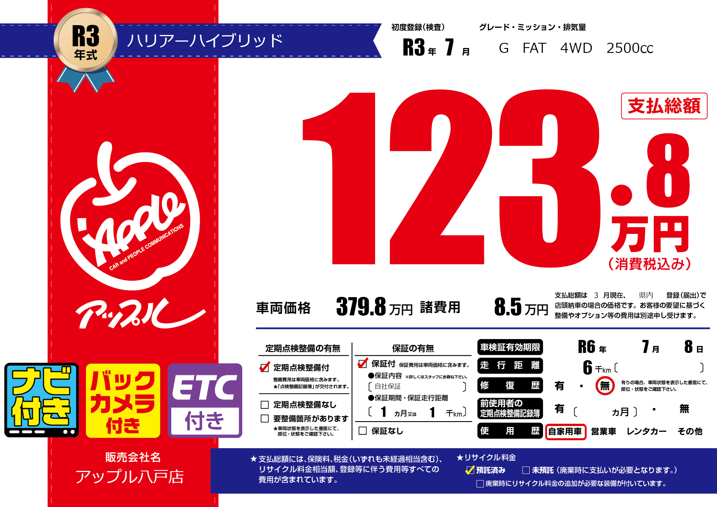 | 走行キロ | 0.6万km | 初年度登録 | R3年7月 |