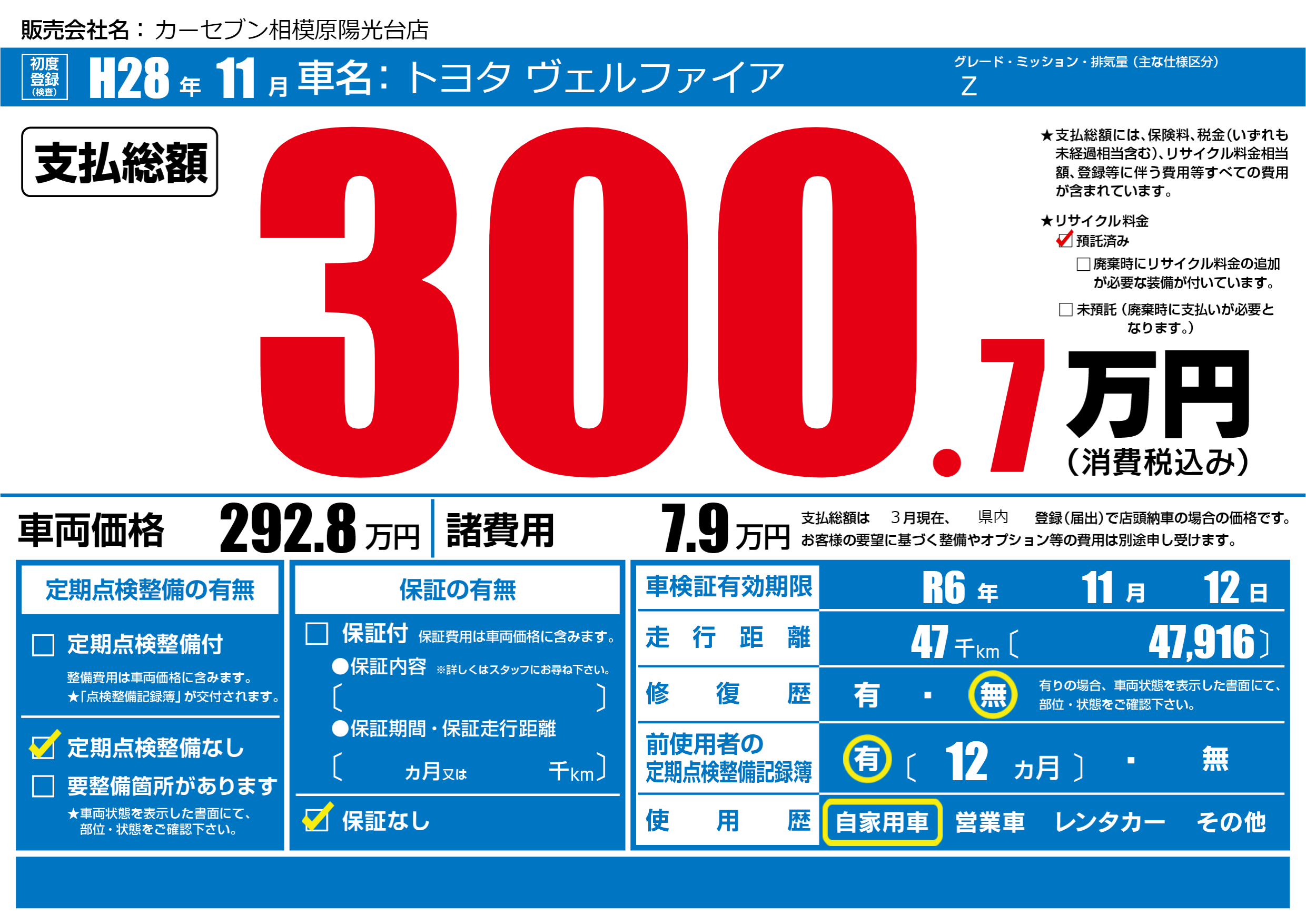 | 車名 | トヨタ ヴェルファイア | グレード ミッション 排気量 |