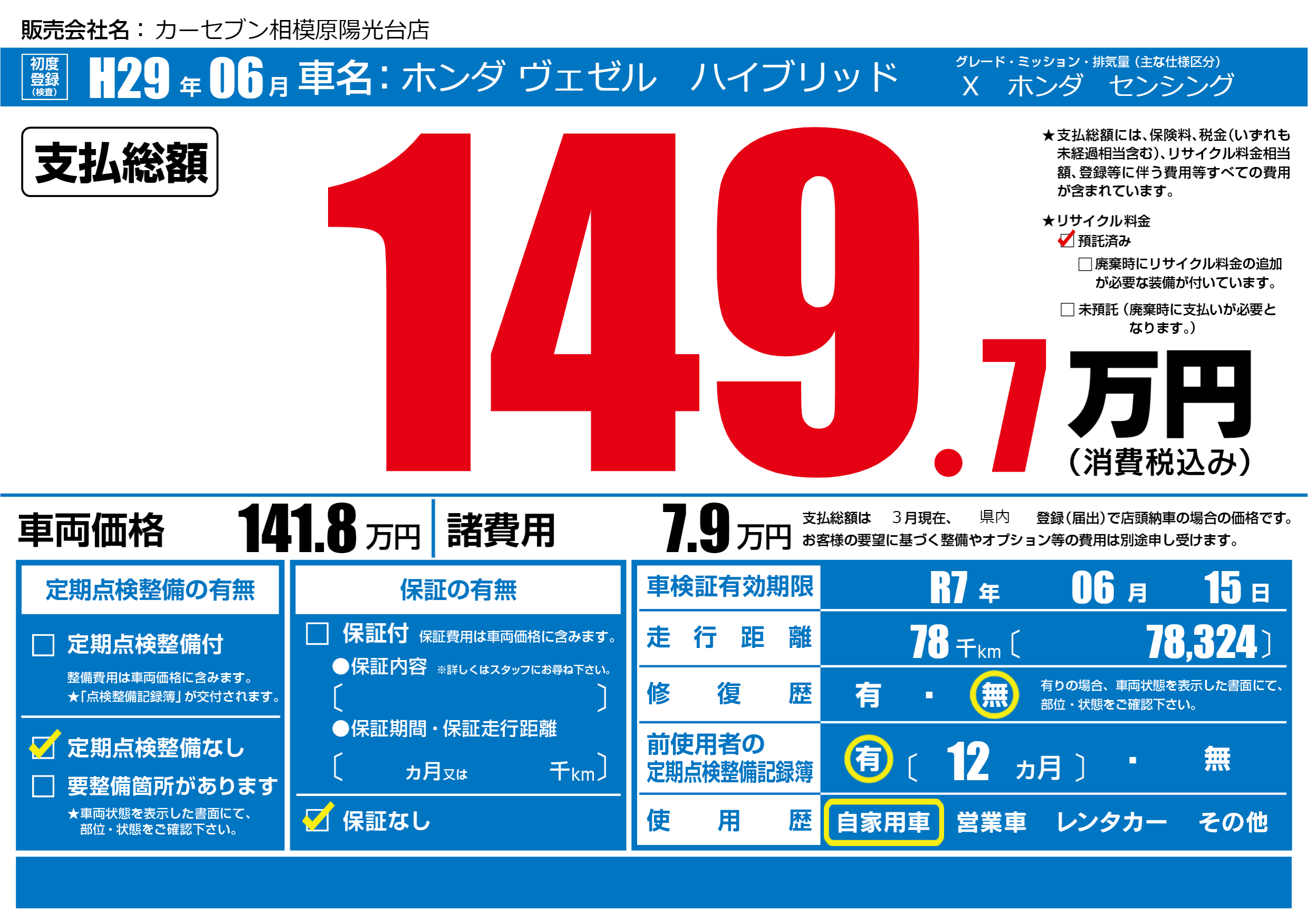 | 車検制限 | R7年 06月 15日 | ||
